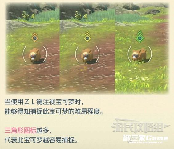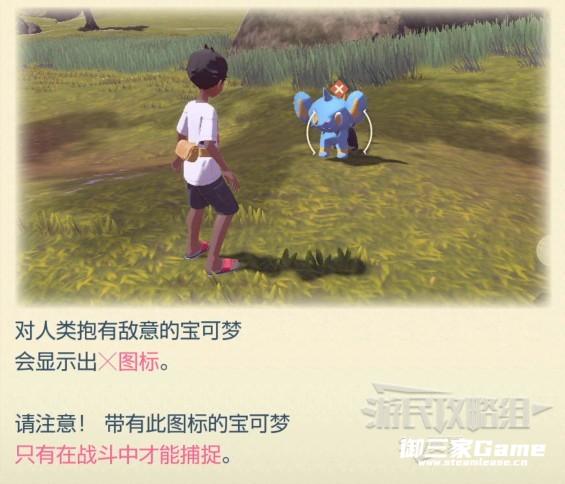 野生宝可梦分为3种:直接丢球捕捉;需要隐藏自己偷袭捕捉;需要战斗捕捉。