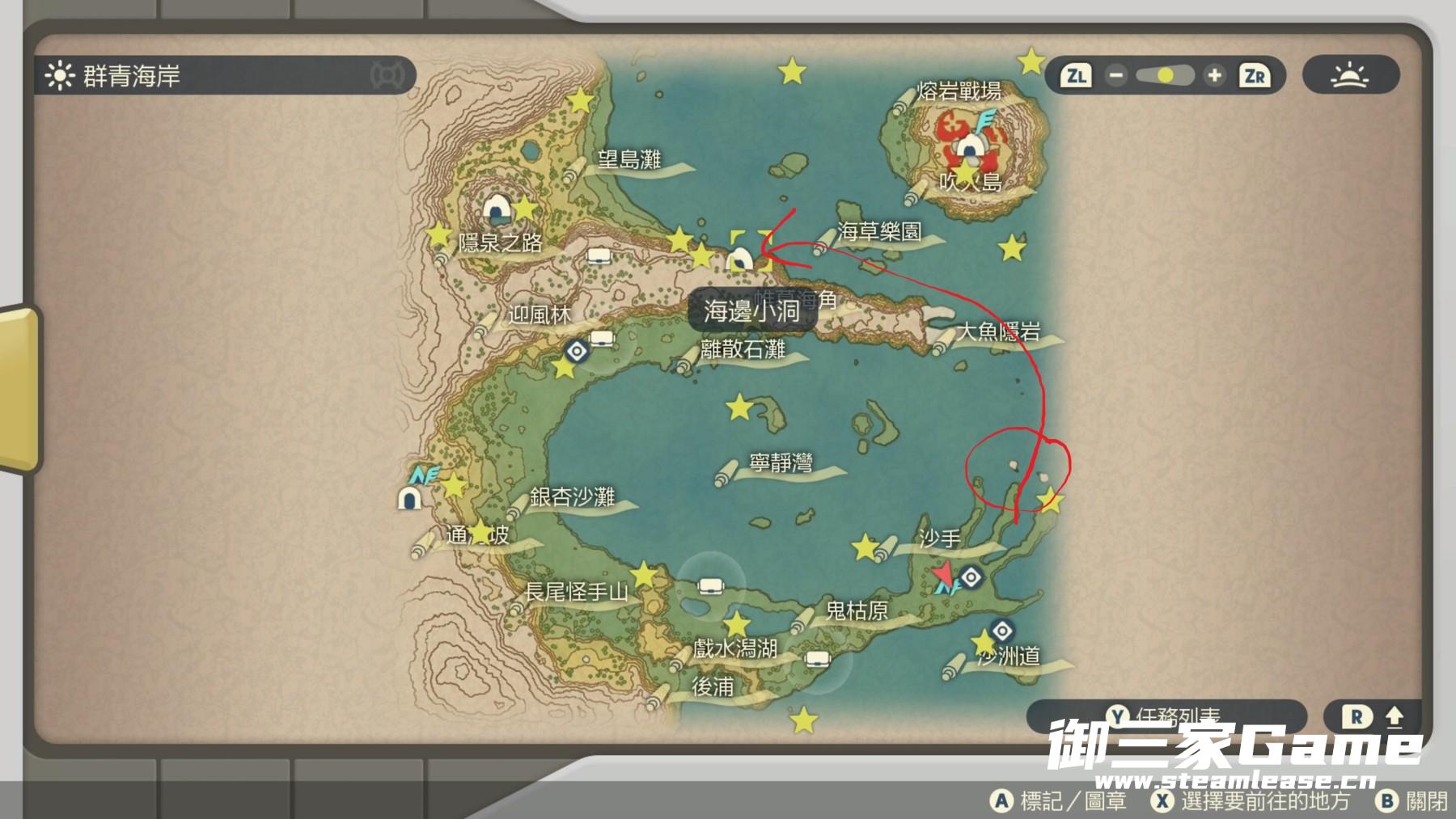 路线就是往东边穿过海之门后到上面的海边小洞。