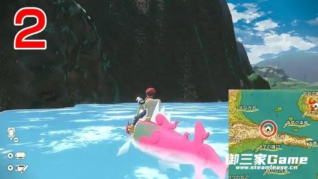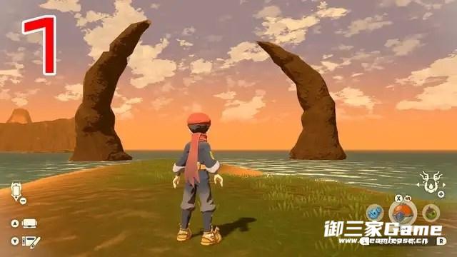 在傍晚携带『小球飞鱼』、『泳圈鼬』、『万针鱼』前往『海岸基地(群青海岸)』穿过东北边(右上)的岩石拱门。