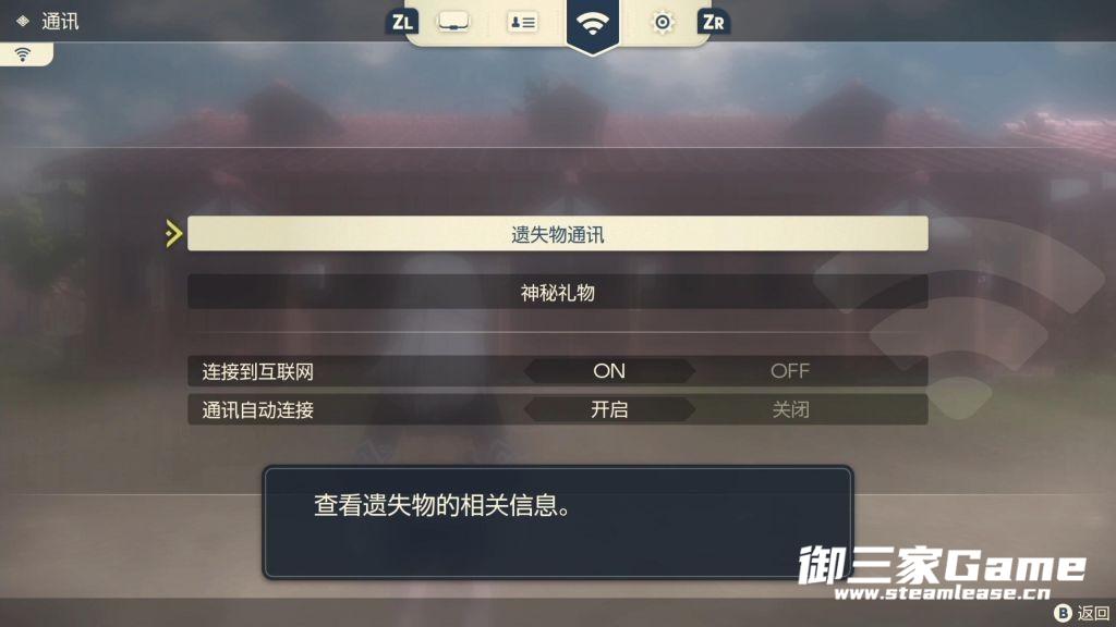 首先,要开启本功能需要完成主线任务直到解锁网络功能,解锁后打开背包会看到屏幕上方一个类似WIFI的图标,按ZL或ZR移动到图标上,屏幕上就会显有遗失物通讯这个功能了