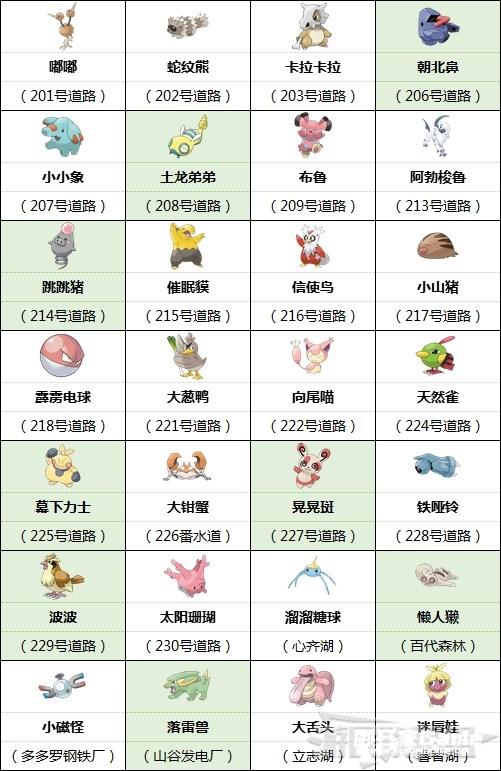 ※仅在【大量出现】时出现的宝可梦以浅绿色背景标注。