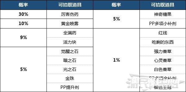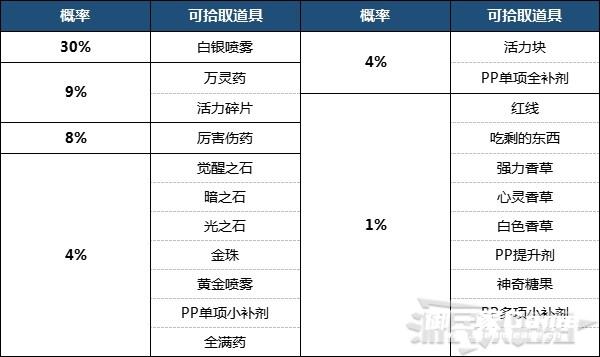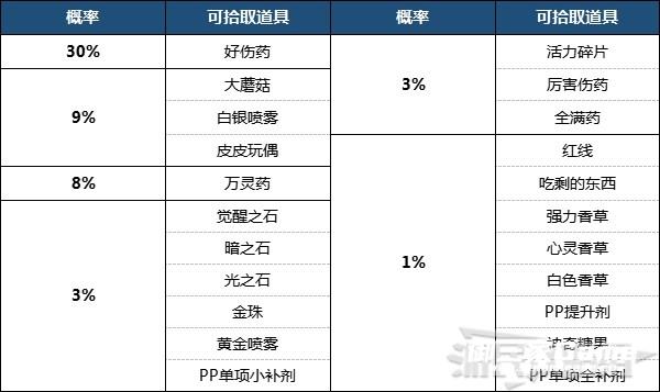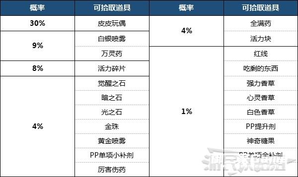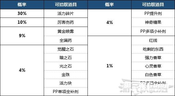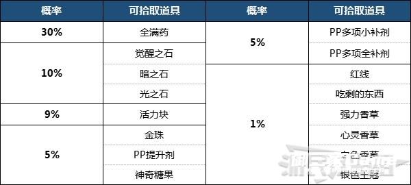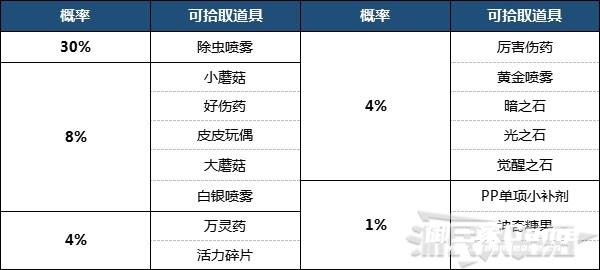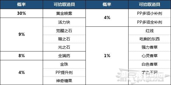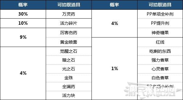 根据拥有【捡拾】特性宝可梦的等级范围变化,通过【捡拾】特性可拾取的道具也有所不同。此外,下方列出的概率均为触发【捡拾】特性后的概率,所以如果包含触发【捡拾】概率的话,还需要将下方列出的概率缩减1/10才约等于实际概率。