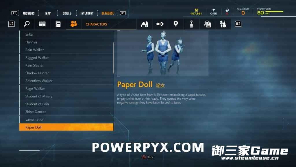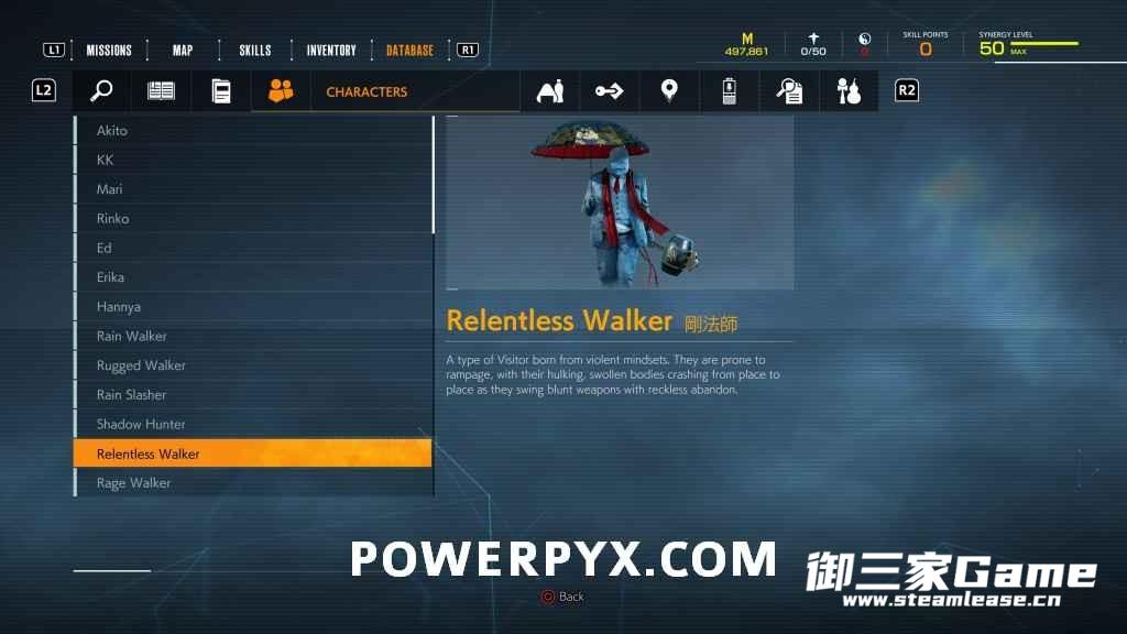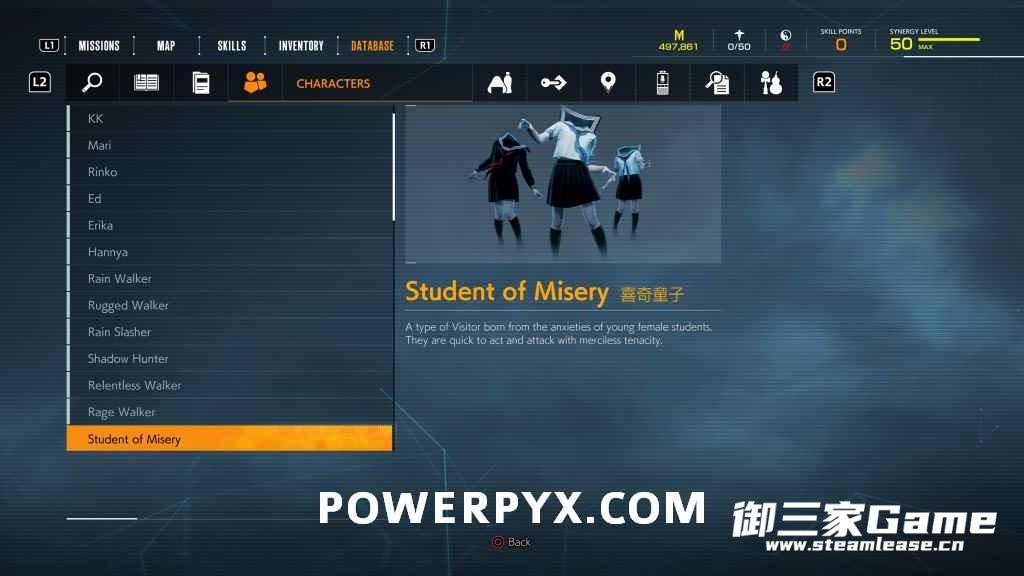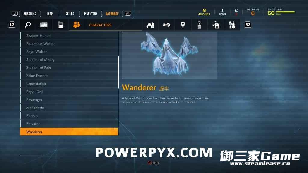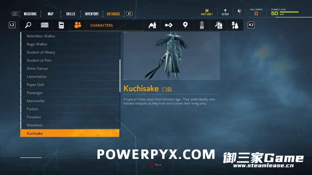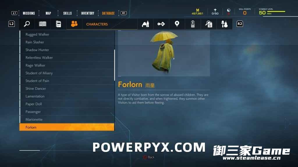 游戏中一共有23种异访者(19种普通敌人和4个BOSS),其中“雨童”和“血童”比较难遇到,而且这两种敌人在发现我们时会立刻逃跑,因此遇到时一定要赶紧追上去。