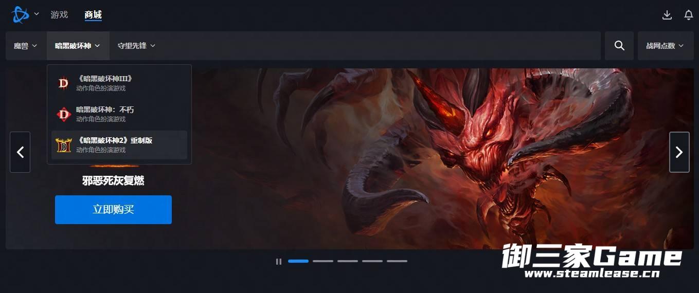 战网桌面应用:点击战网桌面应用上方的“商城”按钮,点击【暗黑破坏神】-【《暗黑破坏神2》重制版】选项。