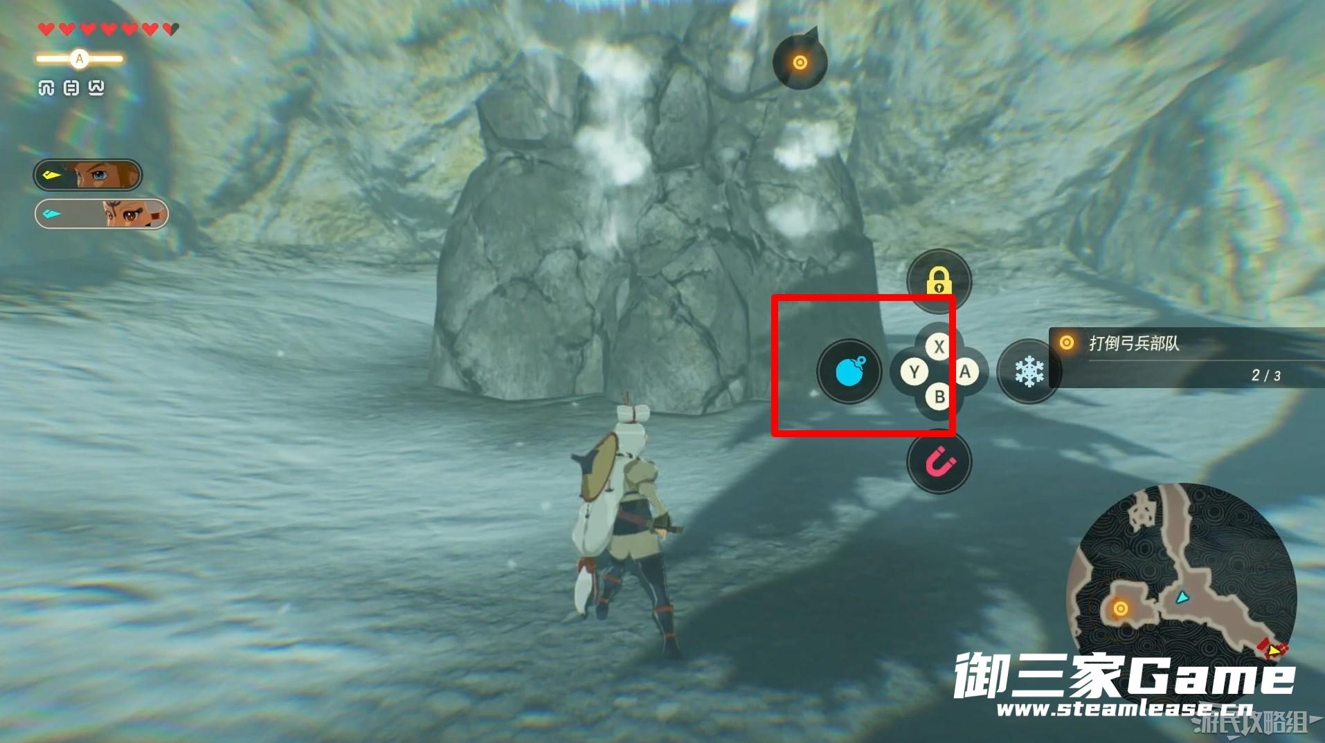 来到被岩石阻挡的上升气流口处,使用炸弹破坏岩石后通过气流飞上上方平台。
