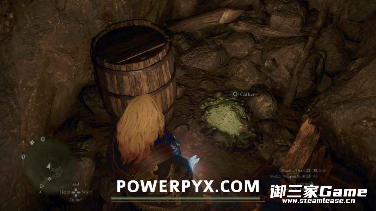 跟着萨拉进入洞穴,洞穴内掉落在地上的绿色材料便是石龙灰,拾取一定数量即可离开洞穴进入剧情,完成此任务。