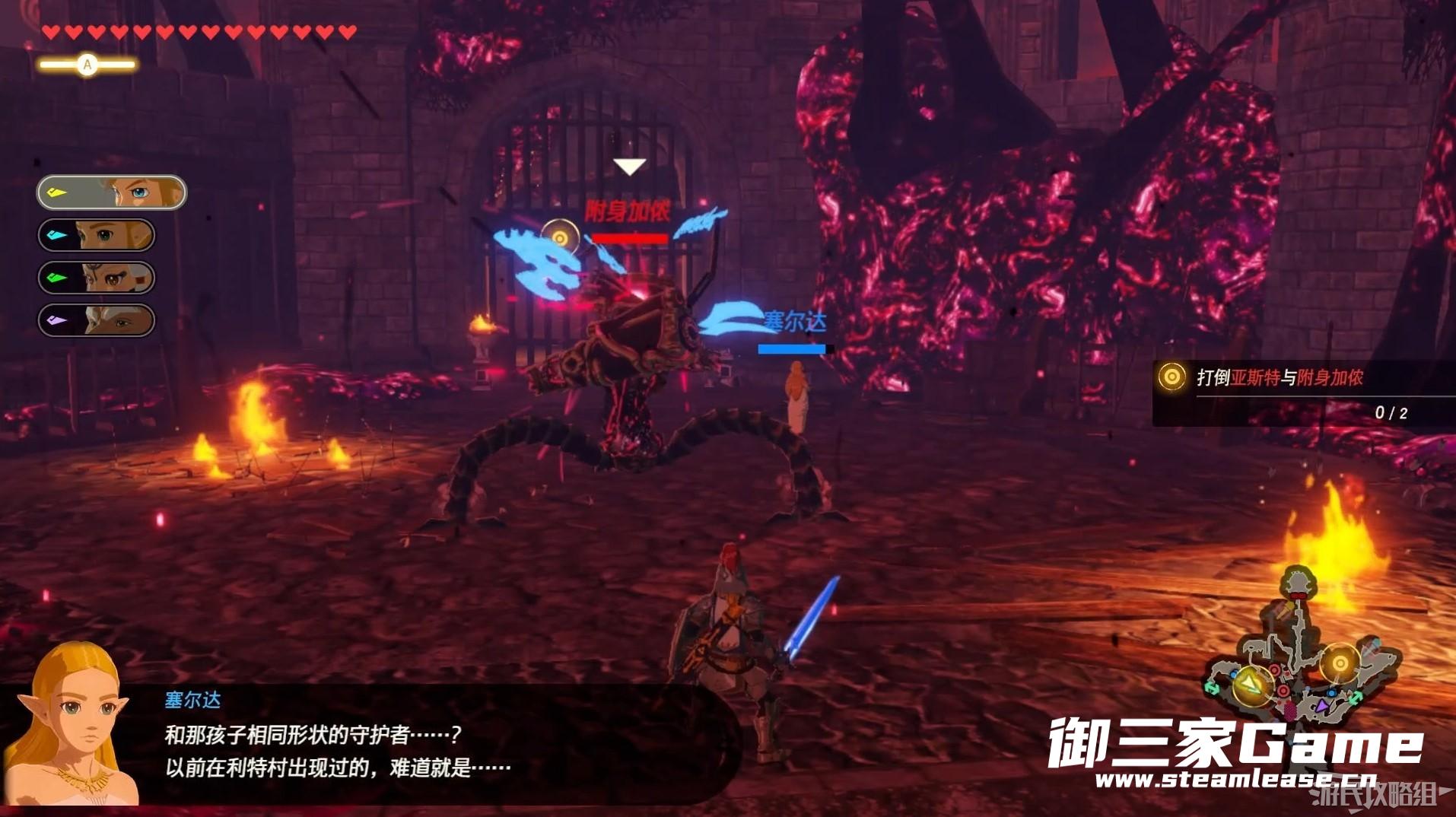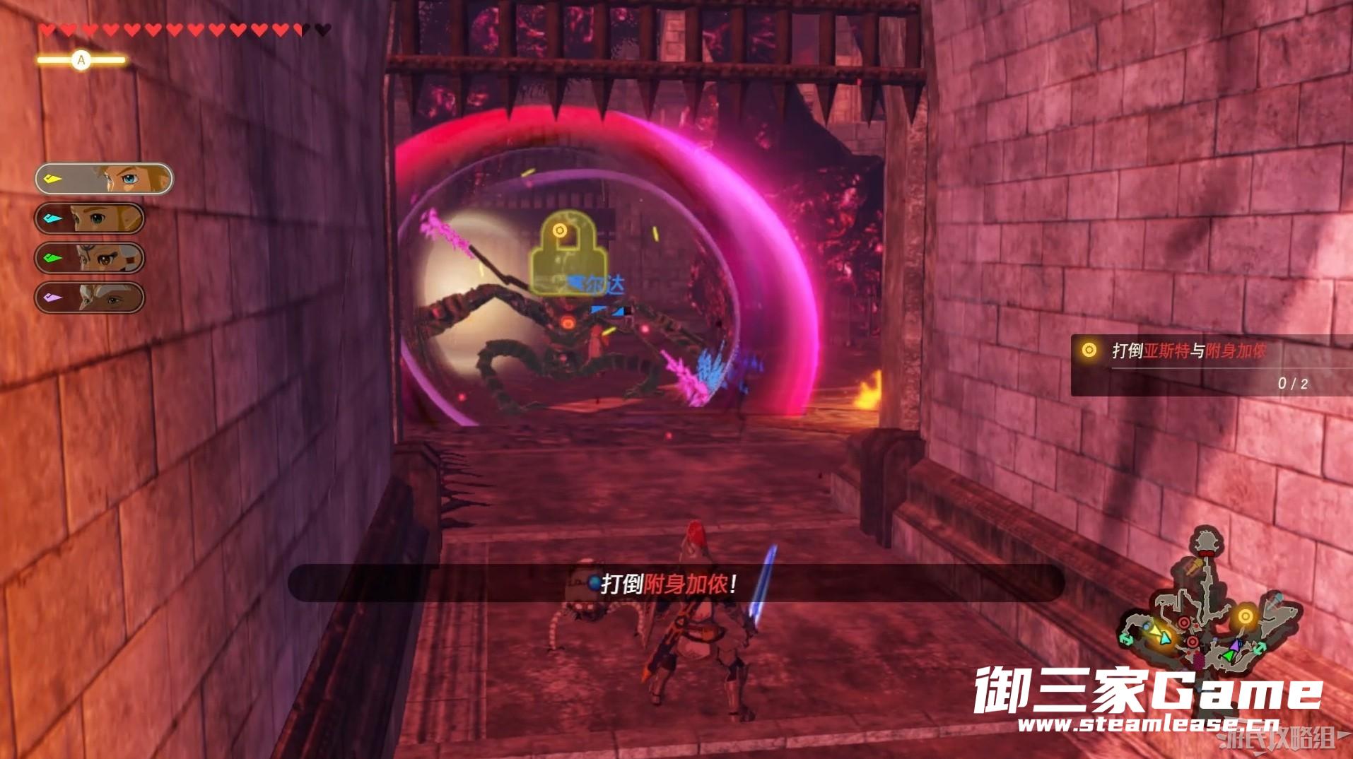 来到地图右侧与亚斯特战斗,亚斯特会召唤林克的灾厄气息幻影,改幻影攻击频率极高十分烦人,建议先将幻影消灭再攻击亚斯特。将亚斯特击败后,亚斯特与附身加侬撤退到城堡更深处,继续追击。