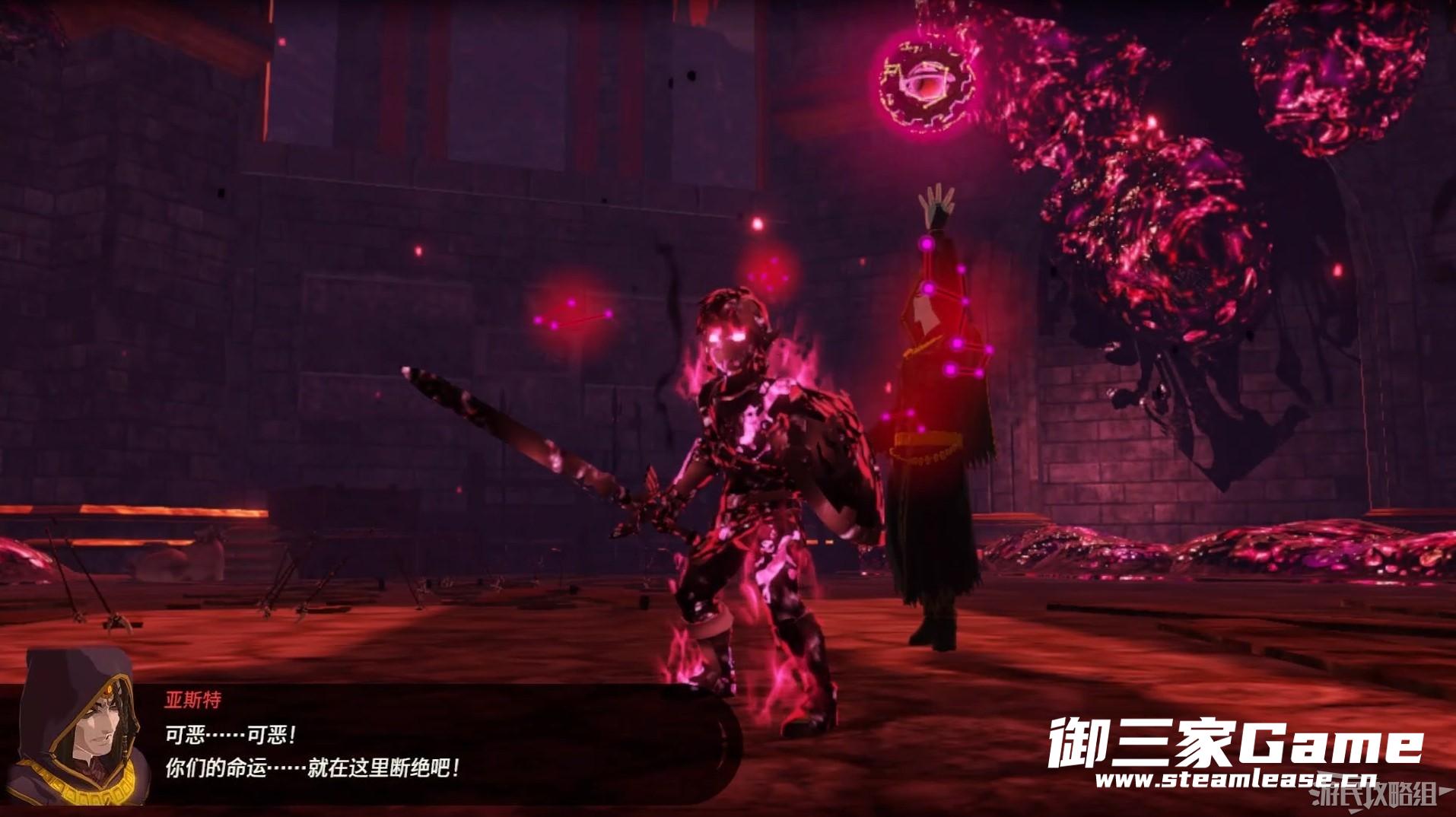 当灾厄加侬生命值降至一半后,城堡地板破裂,众人来到下方房间继续战斗。