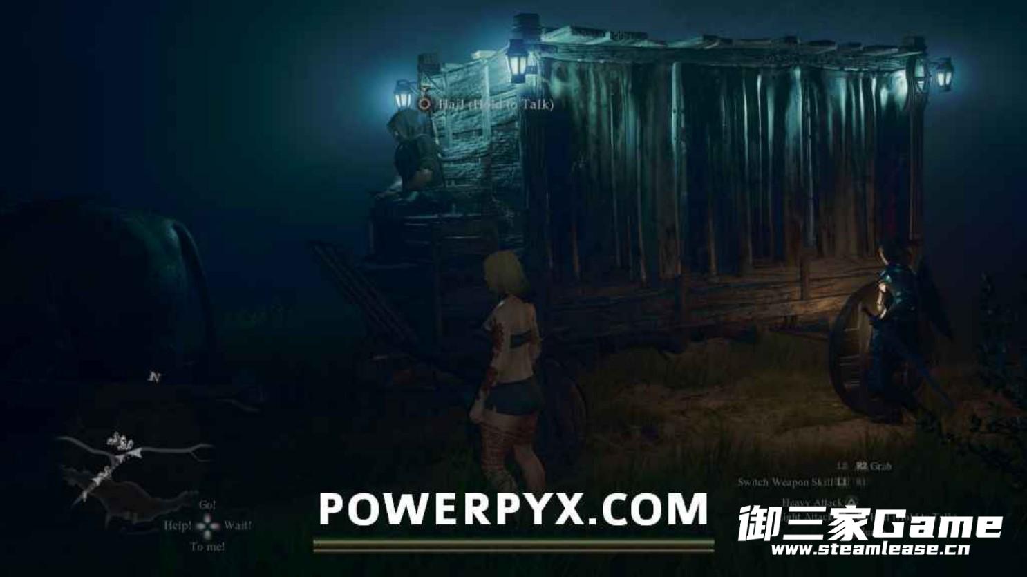 在晚上回到幽灵牛车出现的位置,脱光身上的装备与驾驶牛车的NPC对话上车,跟着被拐卖的追随者一块前往未知的目的地。