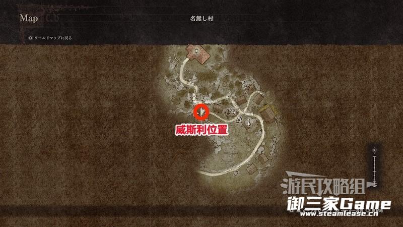 魔导书④掏书《暴雪啊,吼叫吧》,除了与魔导书③禁书《致亡国的丧钟》一起可以在国境监视兵团营地东北边群青瀑布后面的瀑帘洞窟的二层的宝箱中找到之外(参考上文)。还可以在无名村落用赝品的魔导书②庇书《霹雳炸盾》,找到威斯利(位置参考下图)来交换。