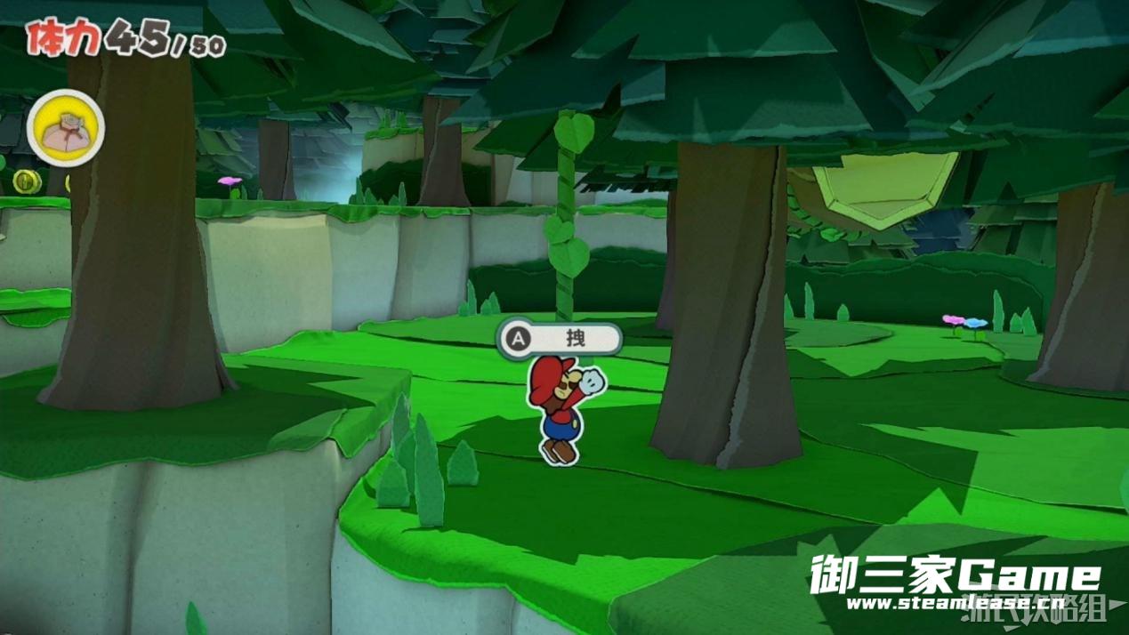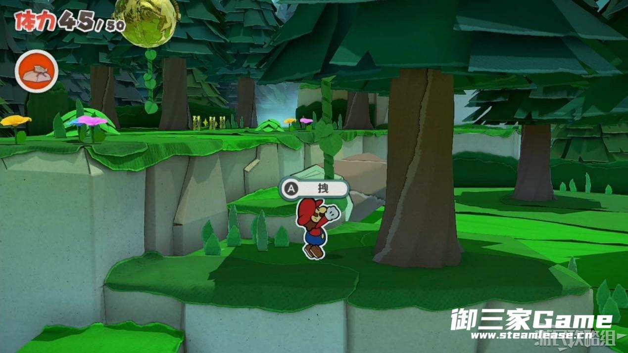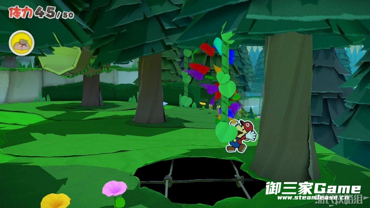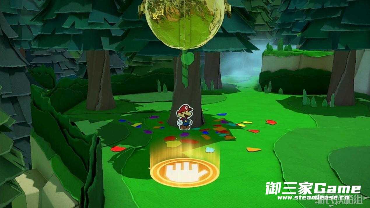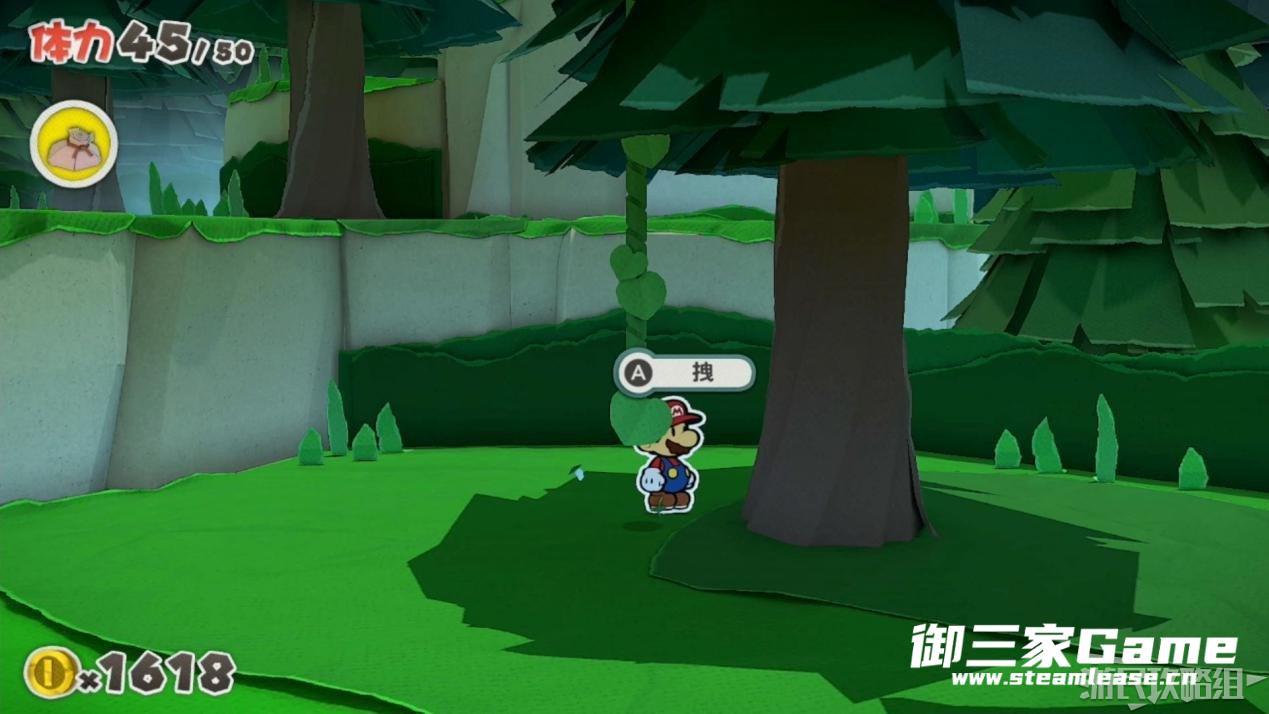 马力欧等人乘坐的飞行装置不幸被折纸王的纸带打中后坠落,马力欧栽进了树立,反复按A从树冠中出来。