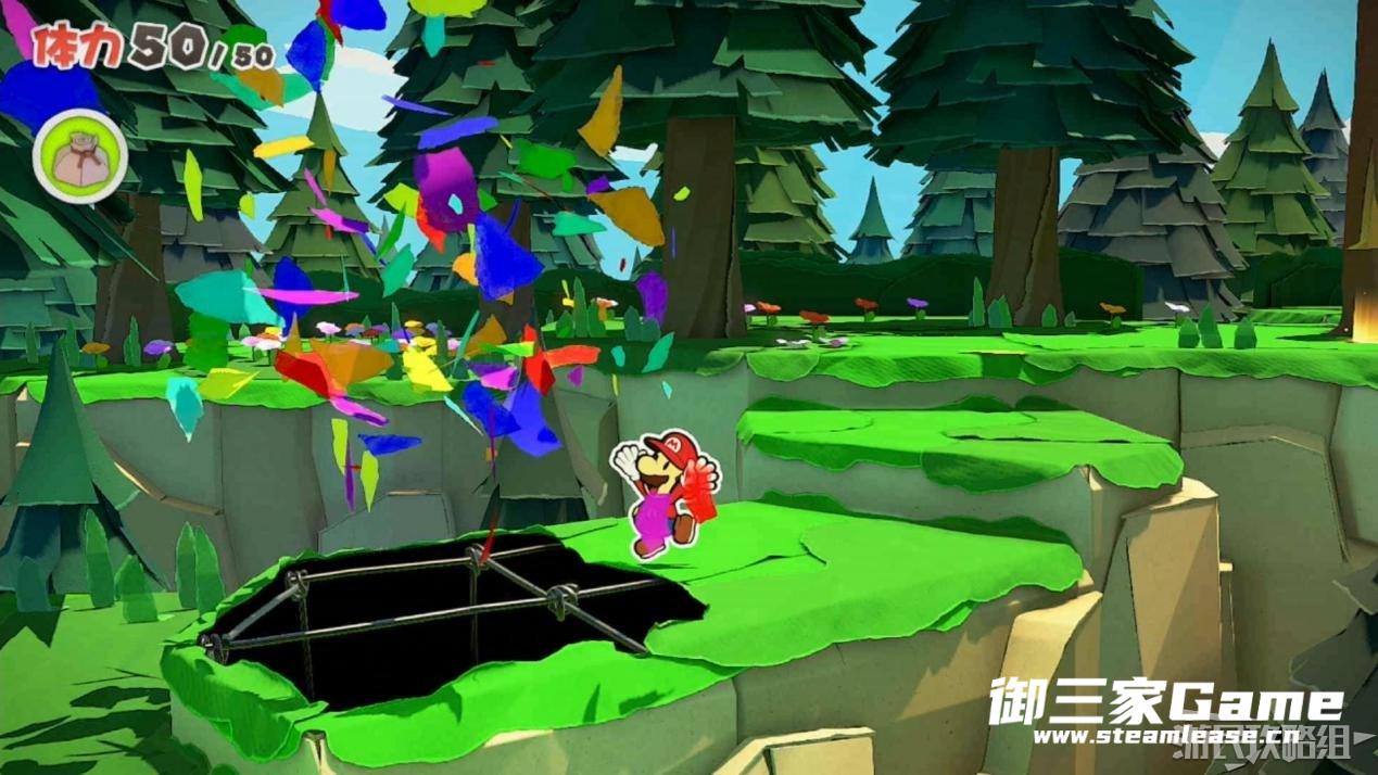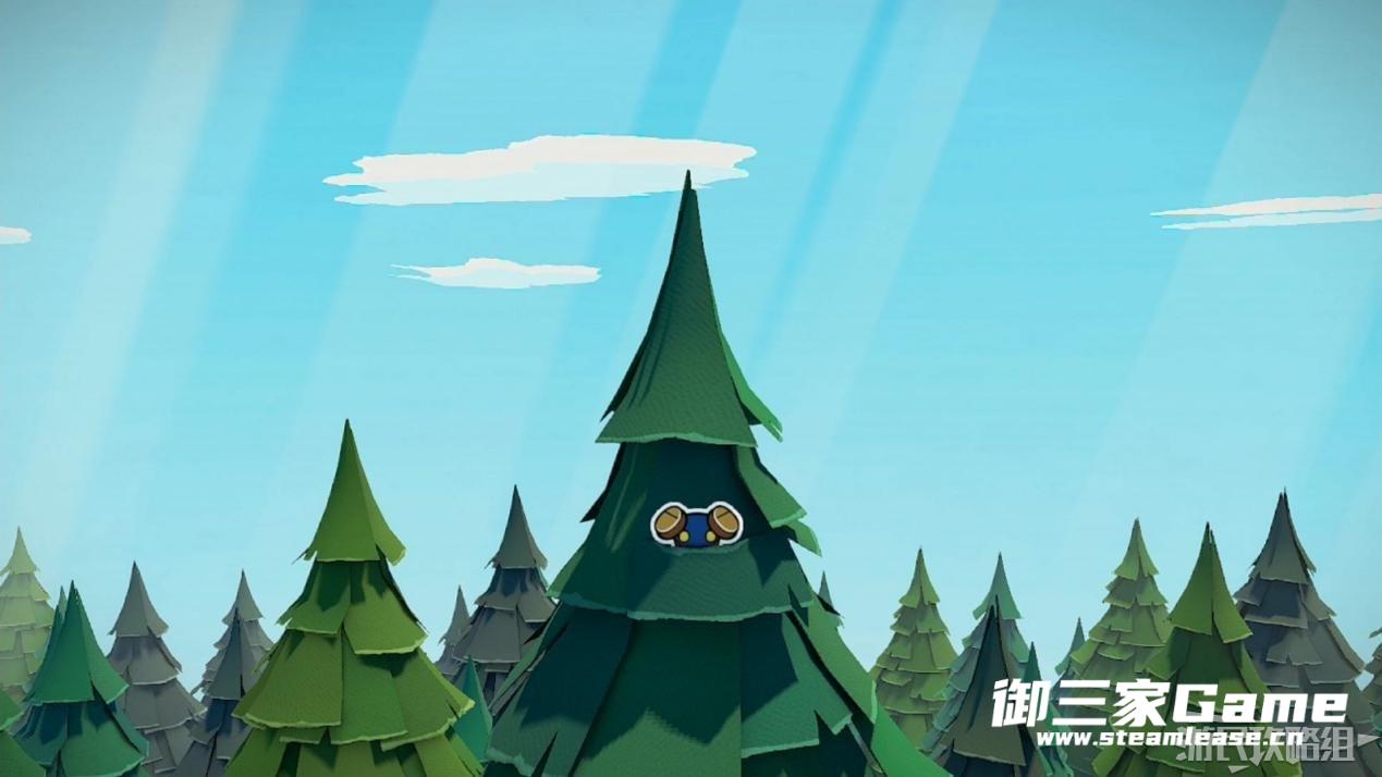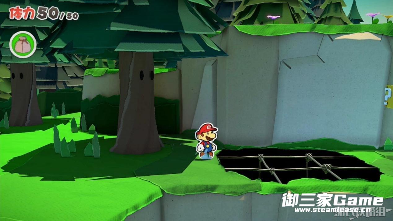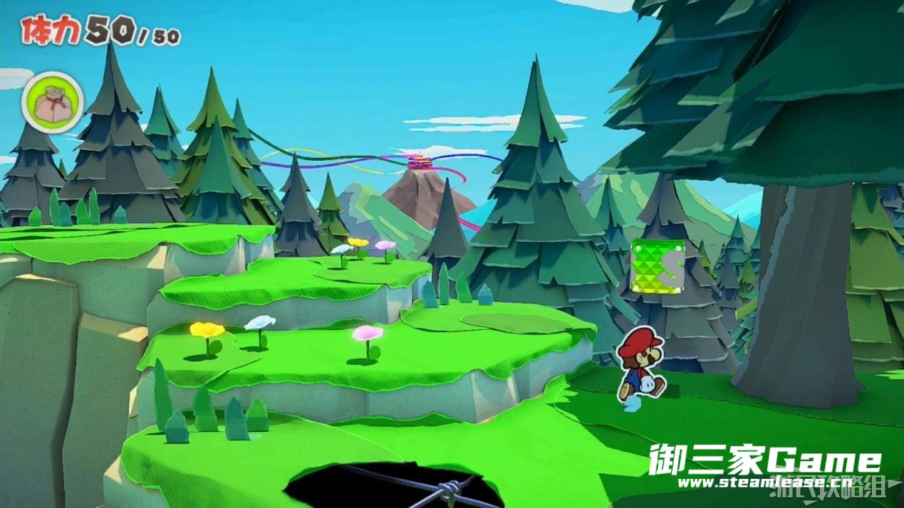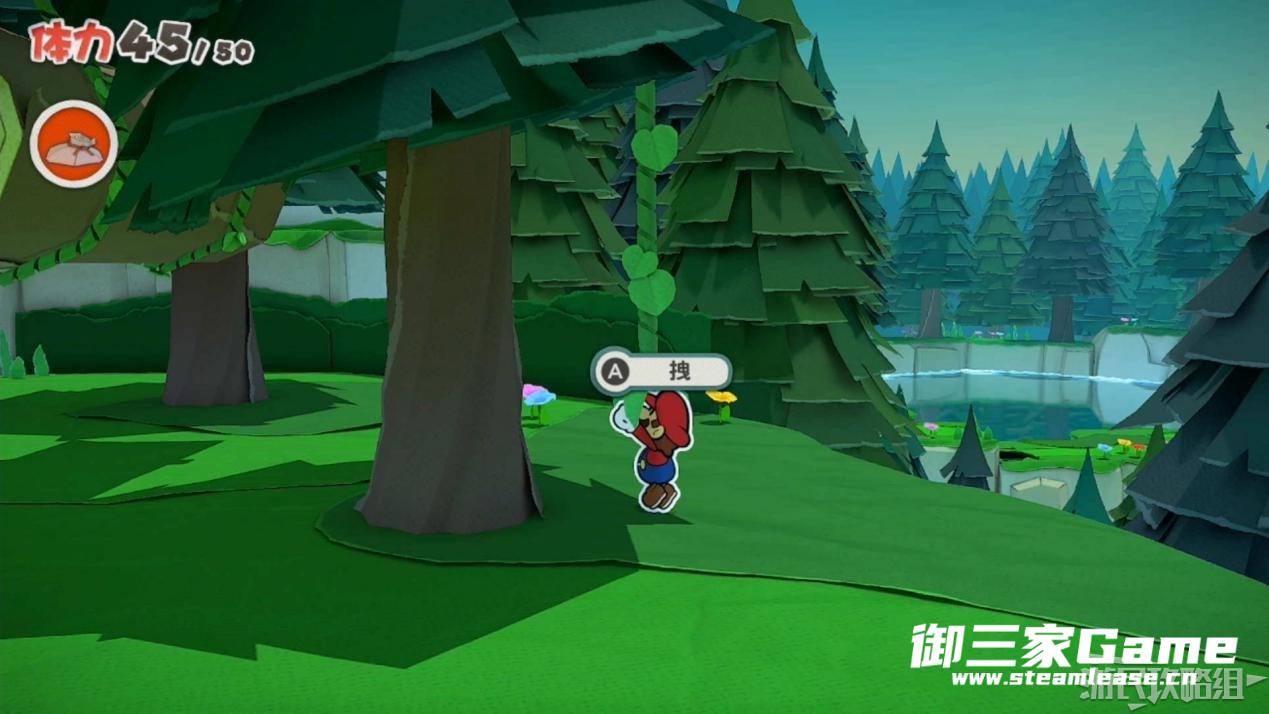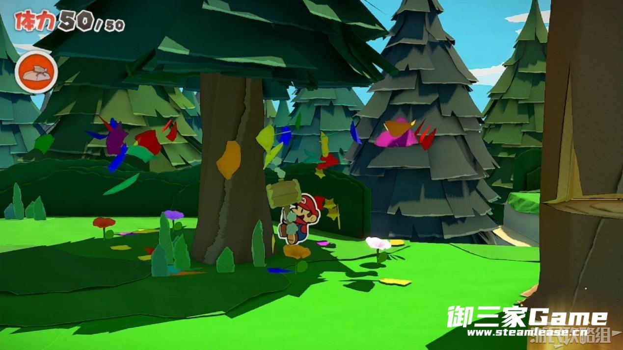 马力欧等人乘坐的飞行装置不幸被折纸王的纸带打中后坠落,马力欧栽进了树立,反复按A从树冠中出来。