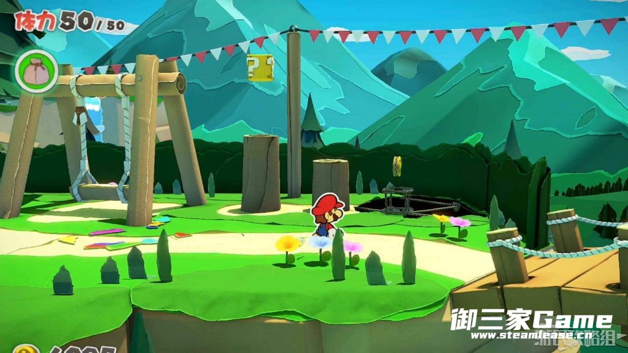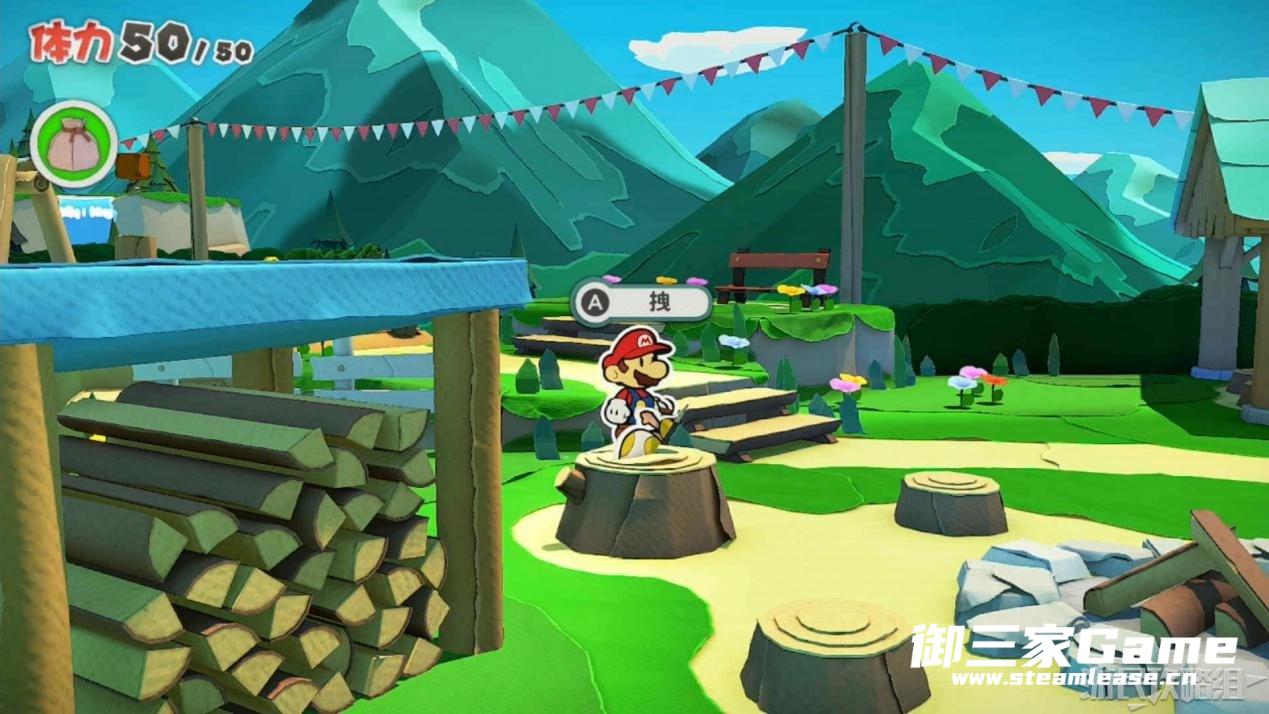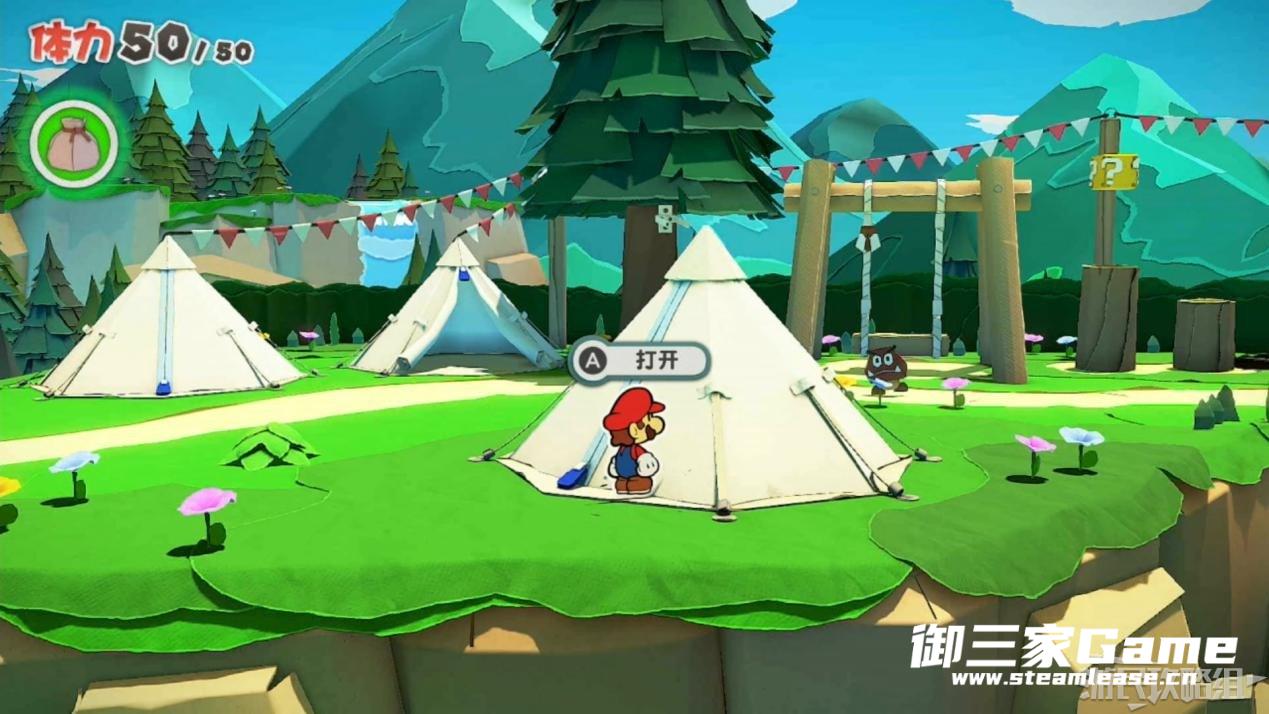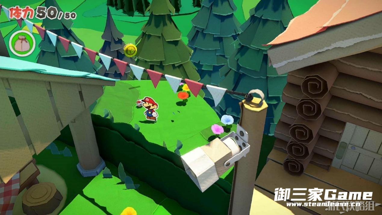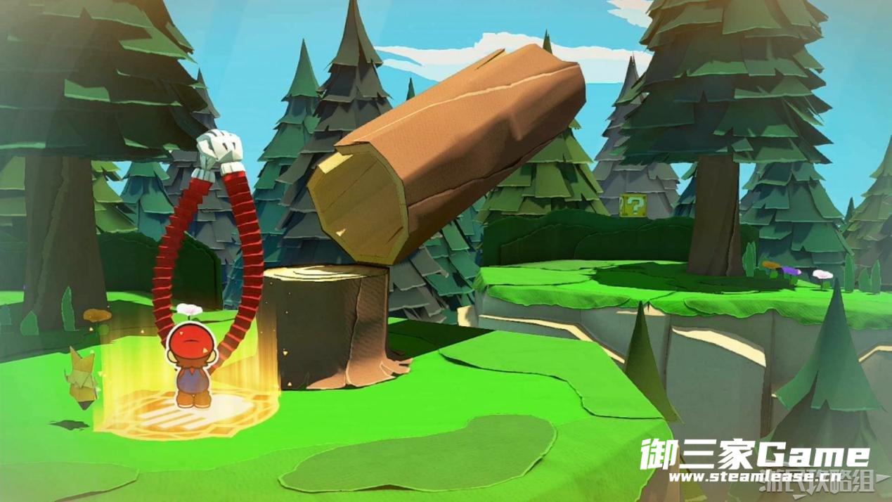 马力欧等人乘坐的飞行装置不幸被折纸王的纸带打中后坠落,马力欧栽进了树立,反复按A从树冠中出来。
