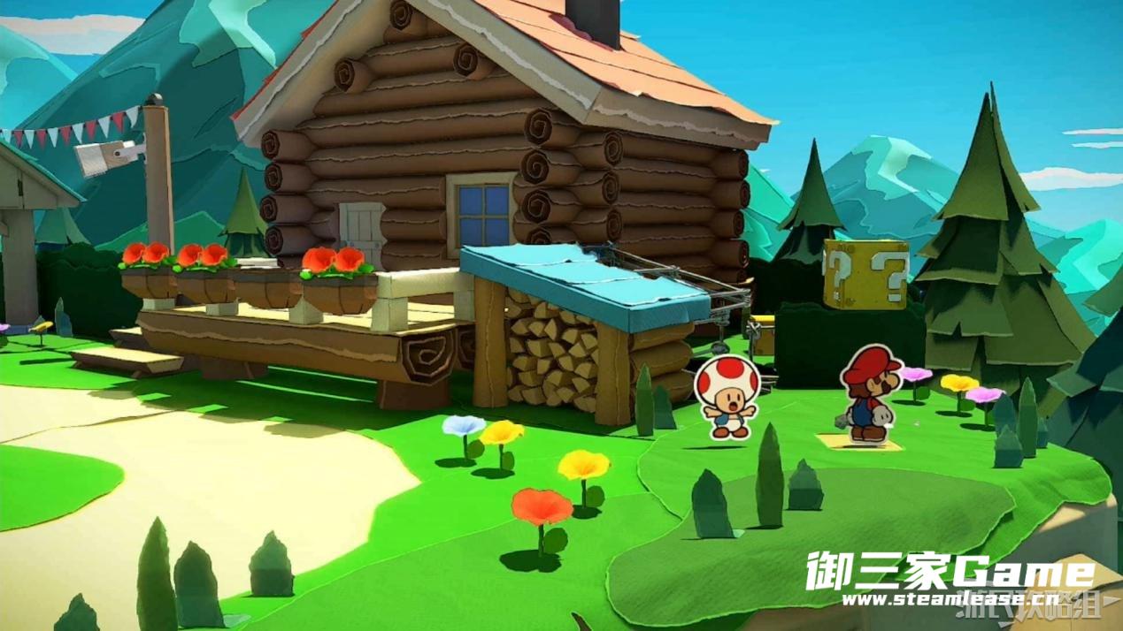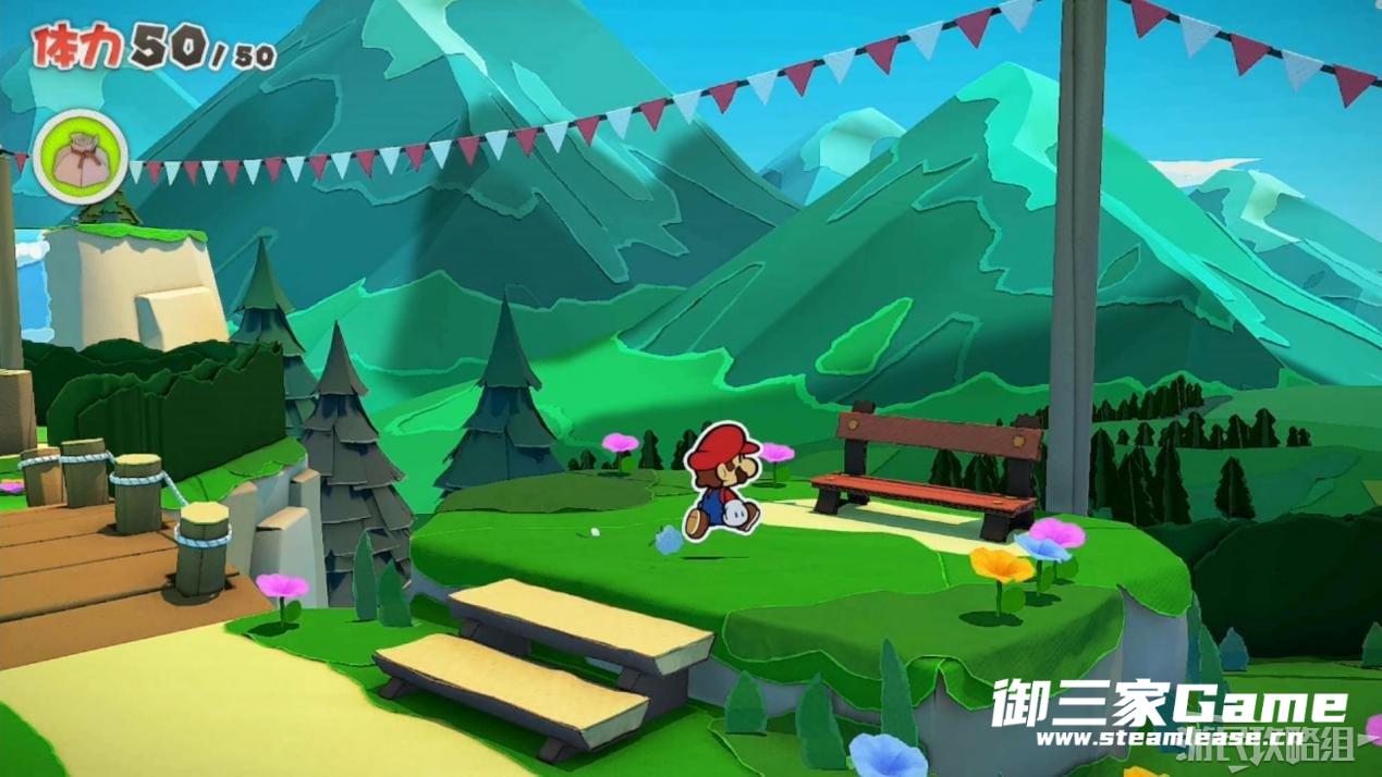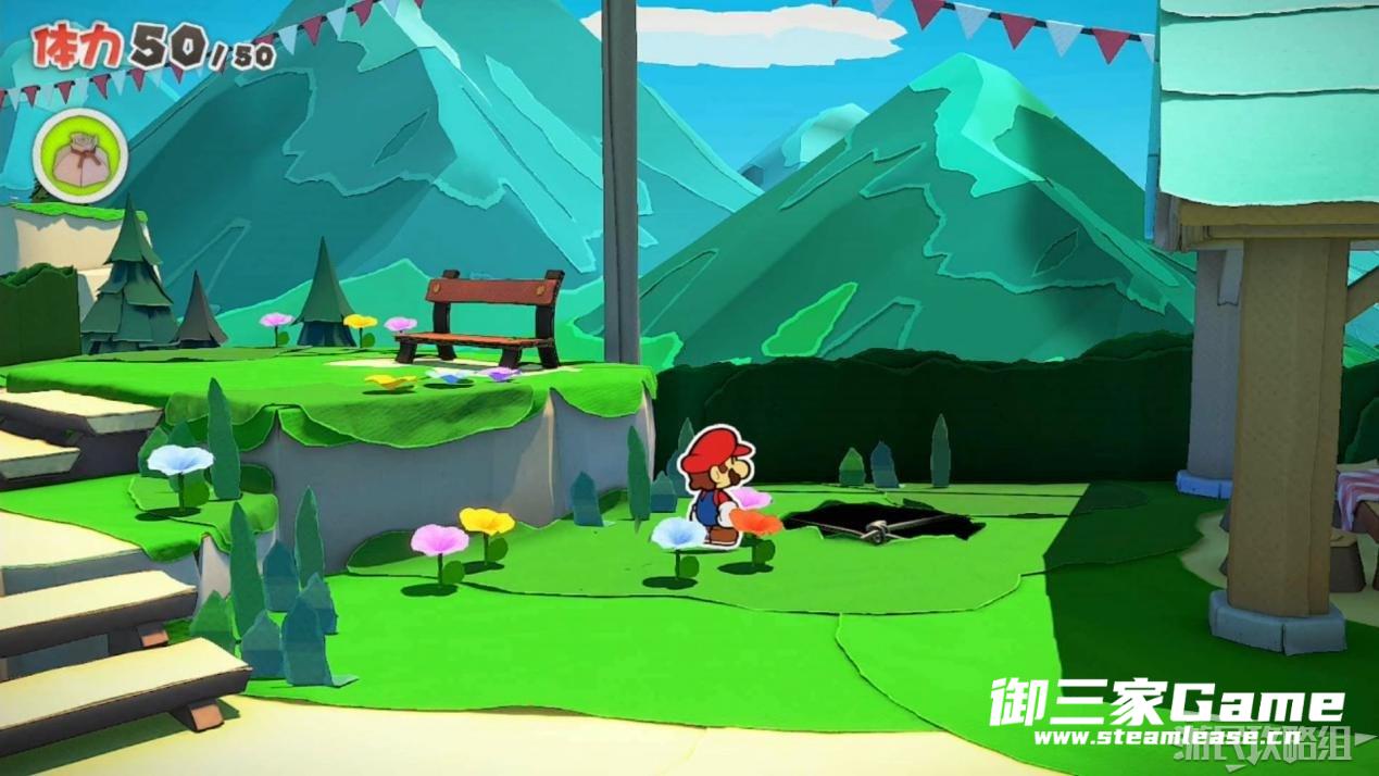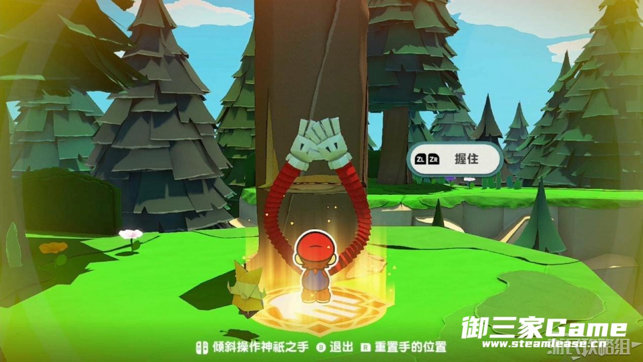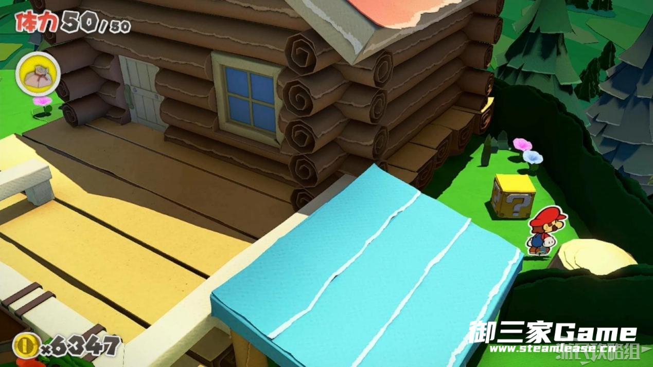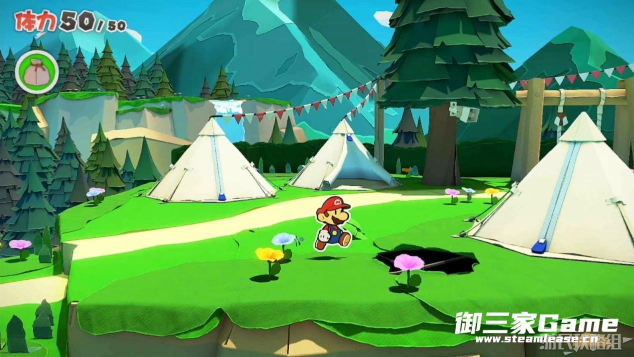 马力欧等人乘坐的飞行装置不幸被折纸王的纸带打中后坠落,马力欧栽进了树立,反复按A从树冠中出来。