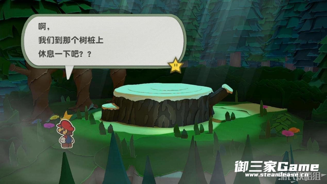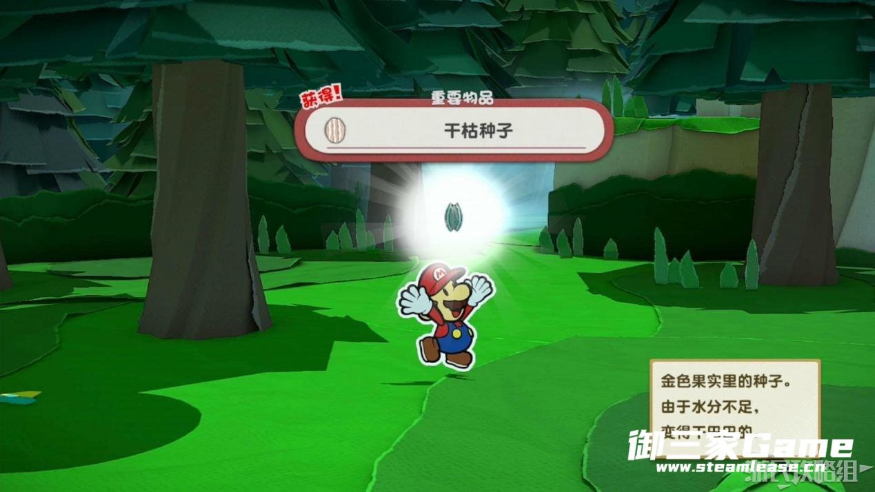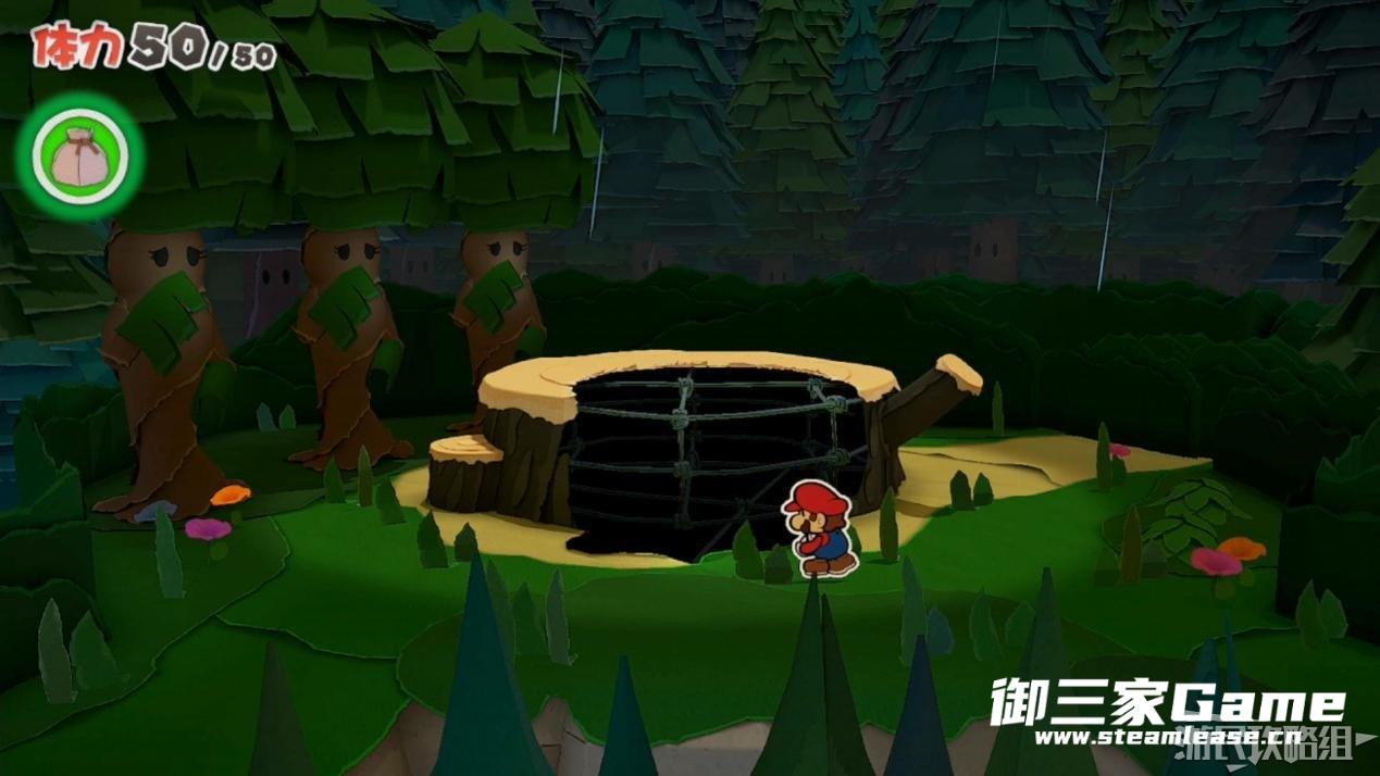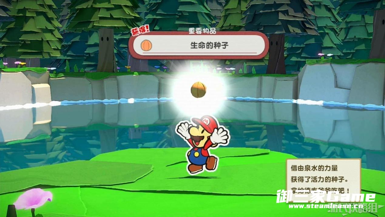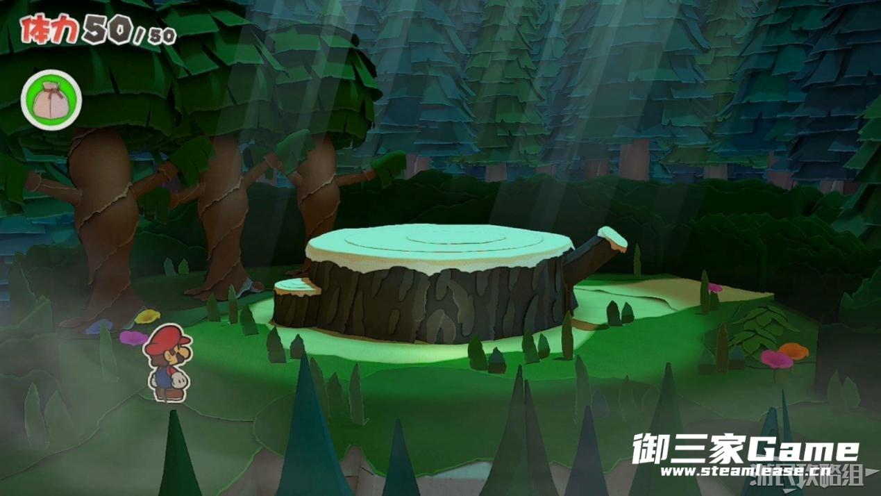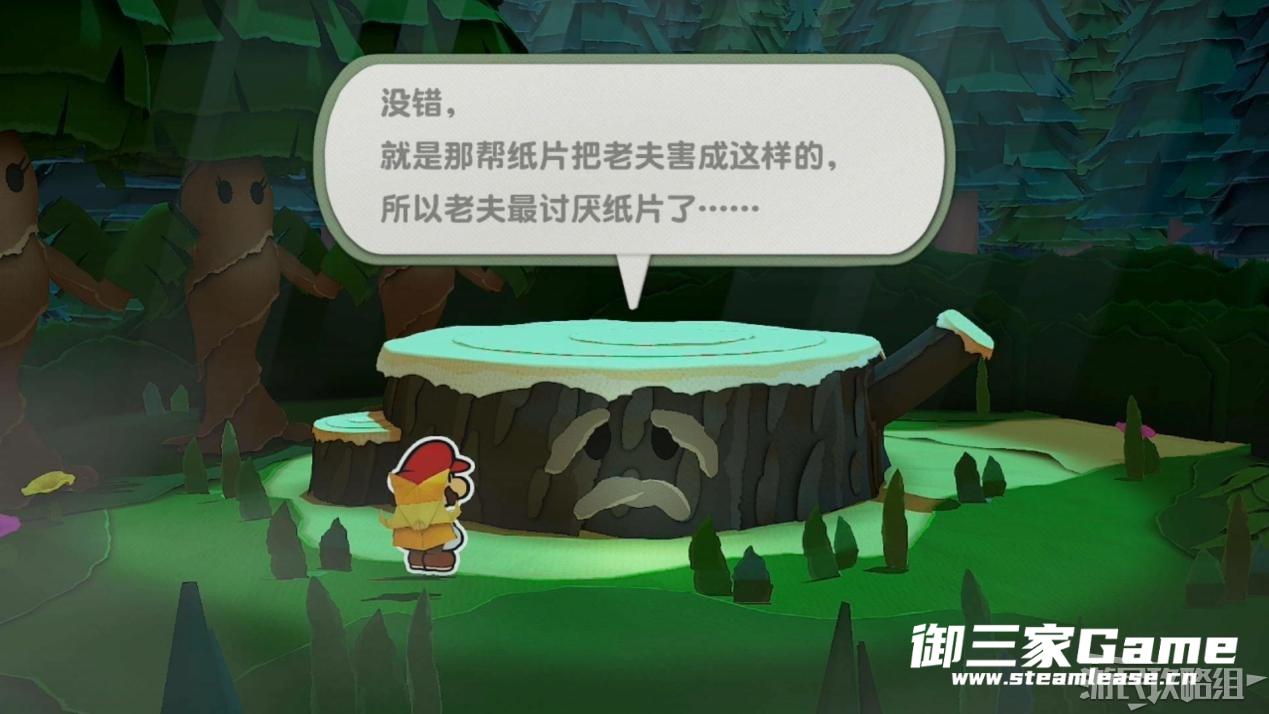 触发剧情,原来大树桩是被折纸砍断的德库爷爷,也正是因为如此德库爷爷十分讨厌纸片,只有能给他带来生命种子才会放马力欧离开。为了帮助马力欧获得生命种子,导致人迷路的阵法暂时解开了,从地图右下角的小路离开前往寻找生命种子。