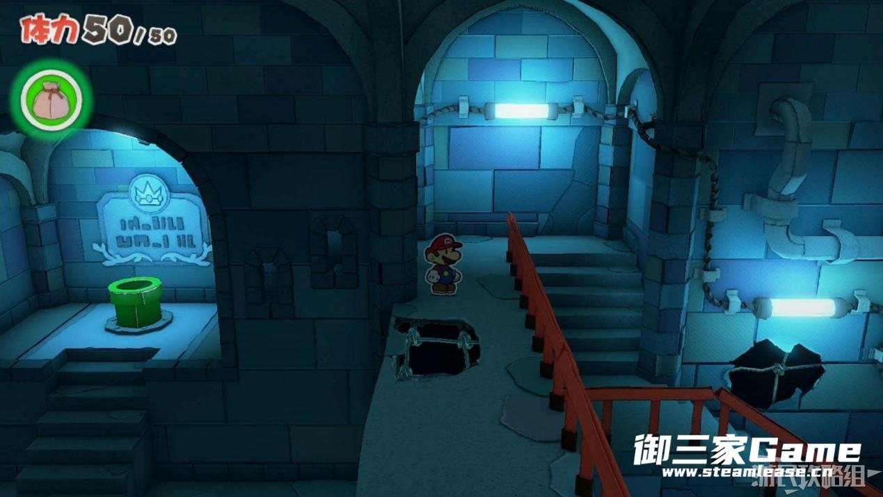 上到绿色管道旁后先不要进入,继续向右走看到两个空心洞。