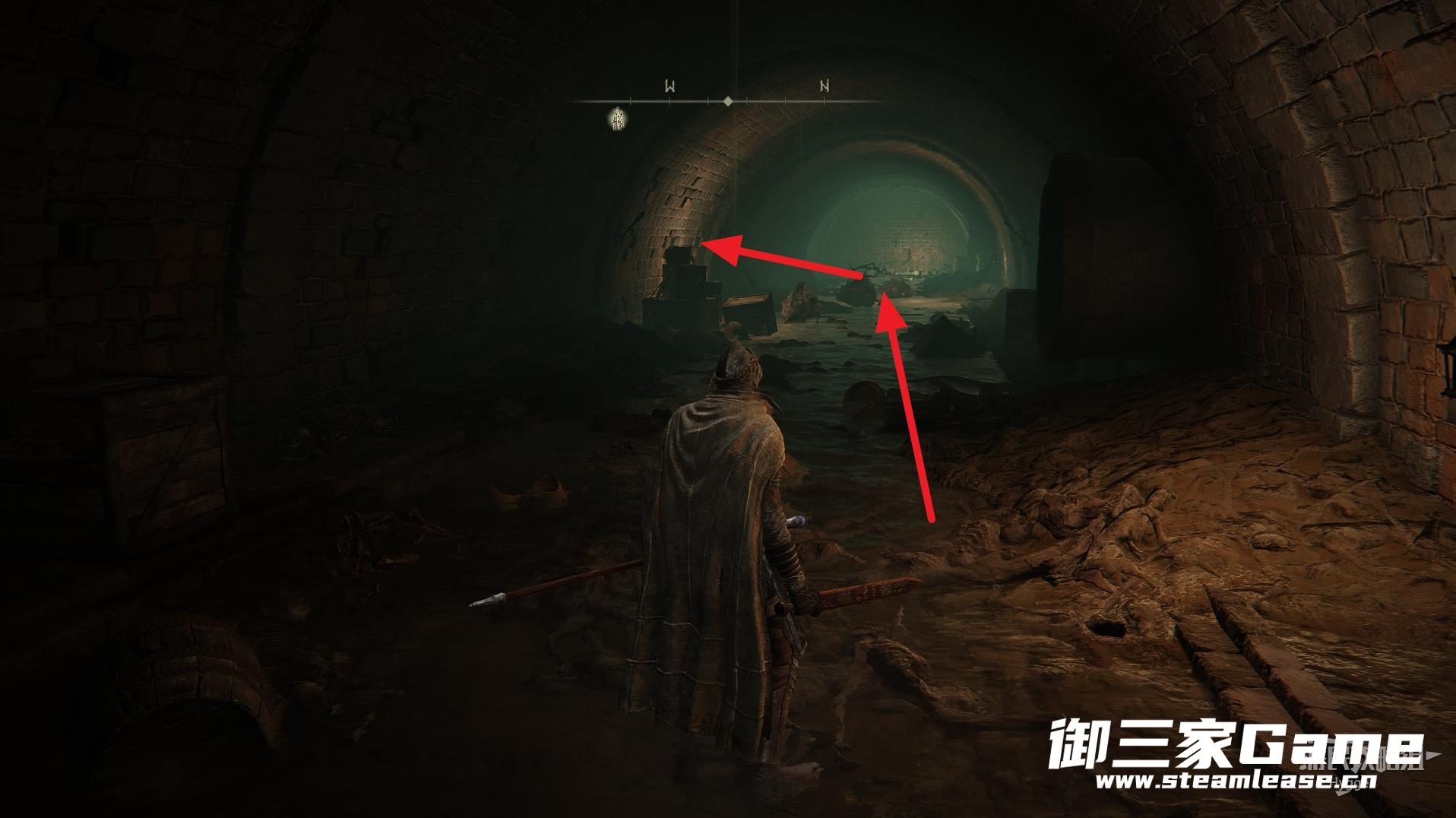 沿着大道前进,在前方地面的缺口处跳入下方管道中。