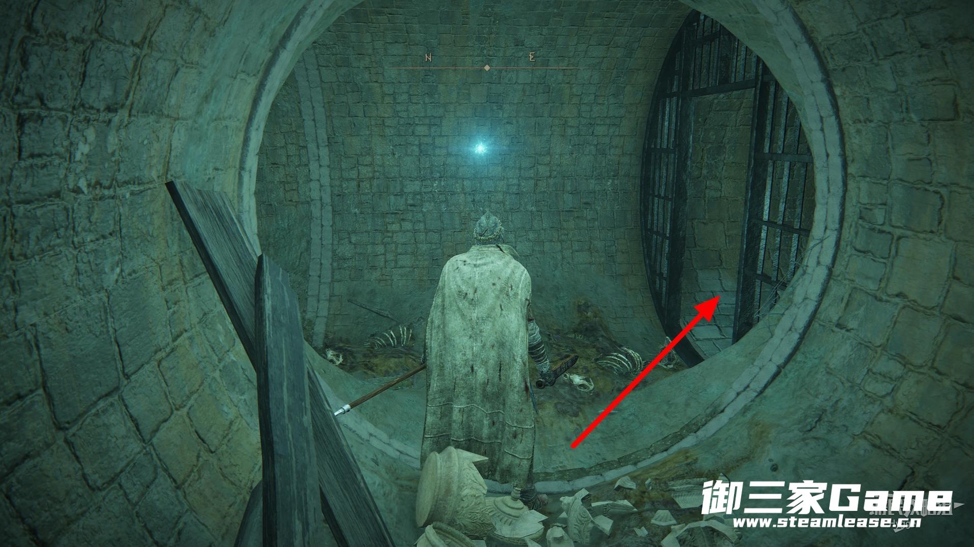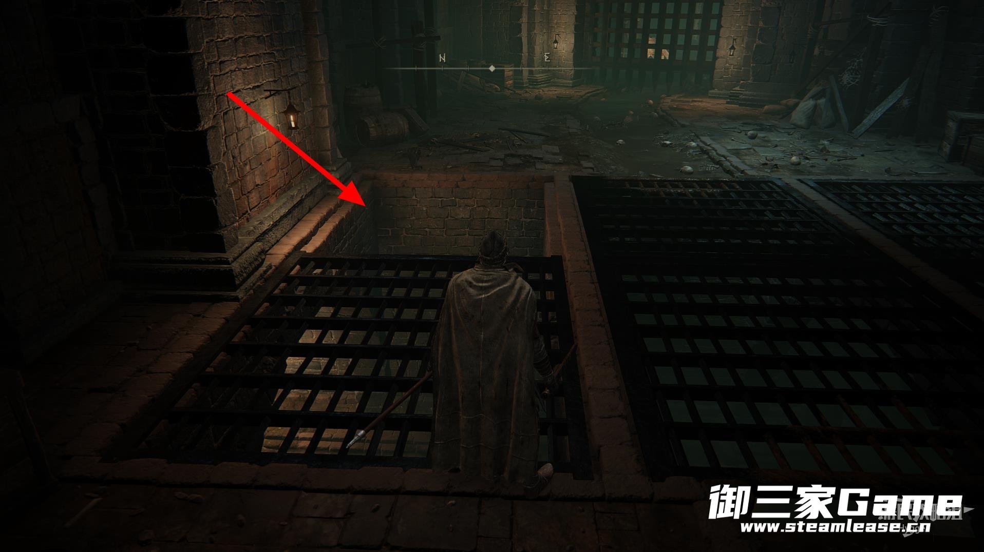 随后再次跳过一个向下的洞口一直向前,来到有铁门的分岔路口时向右。