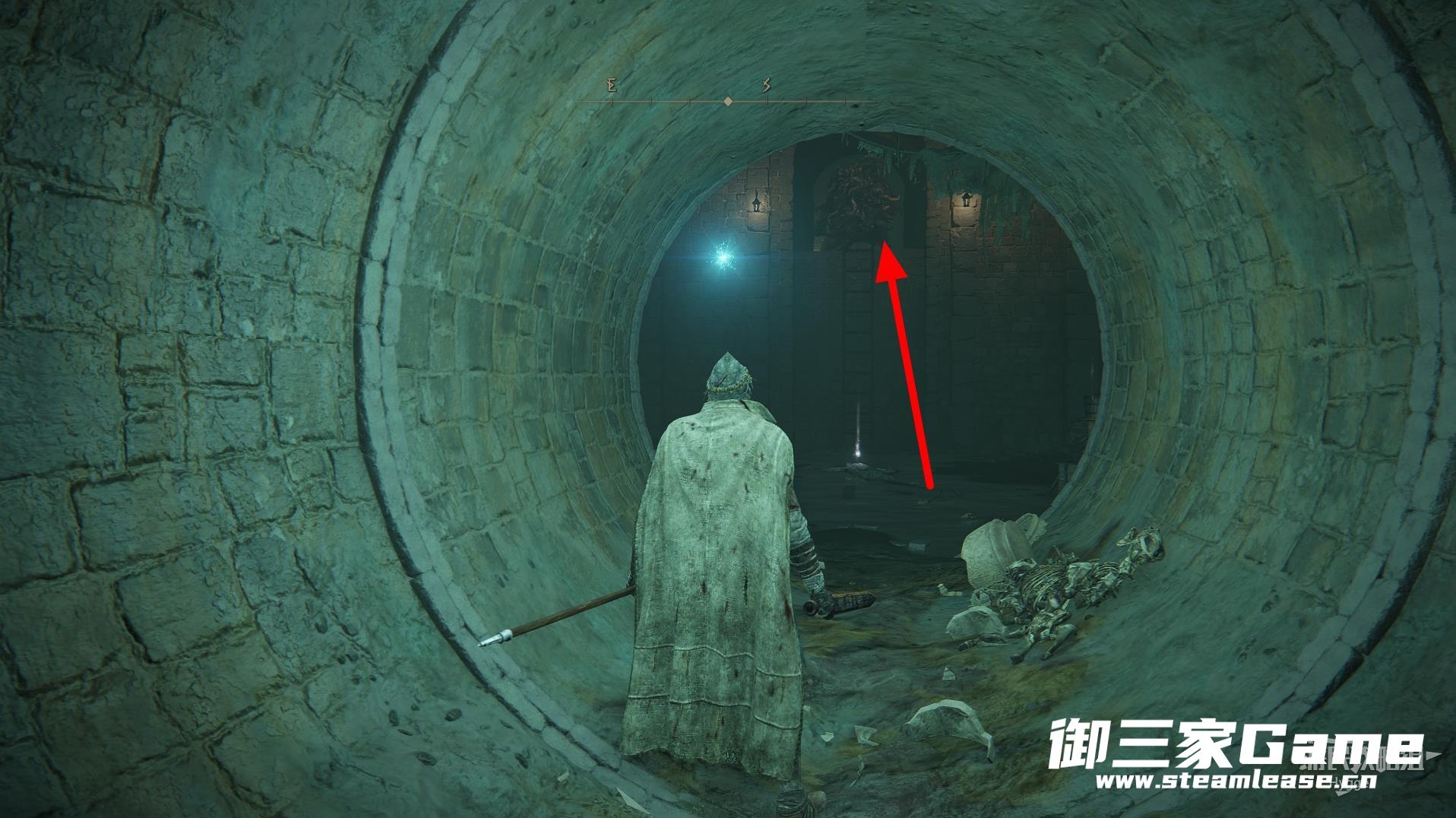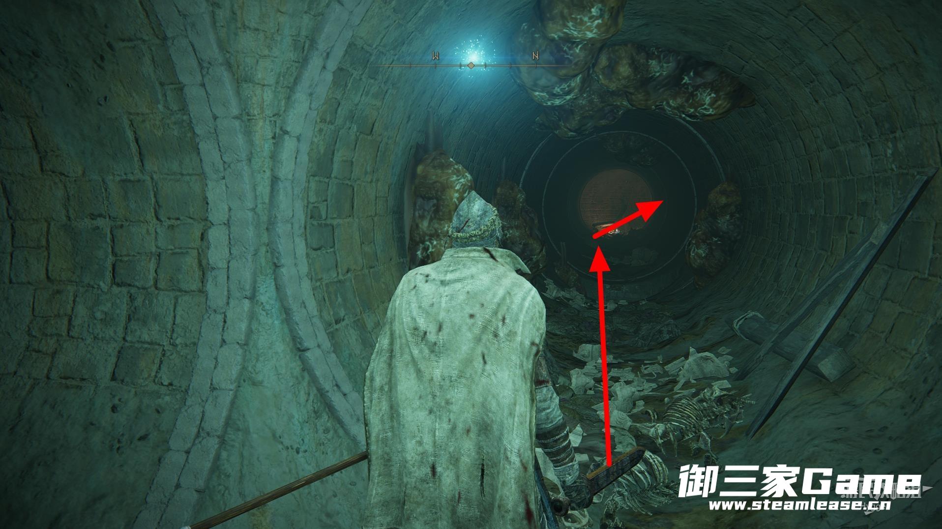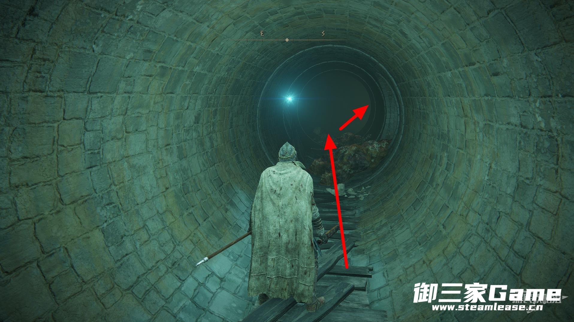 离开赐福所在房间后左转沿着大道前进,来到下图所示位置后从缺口处跳入管道。