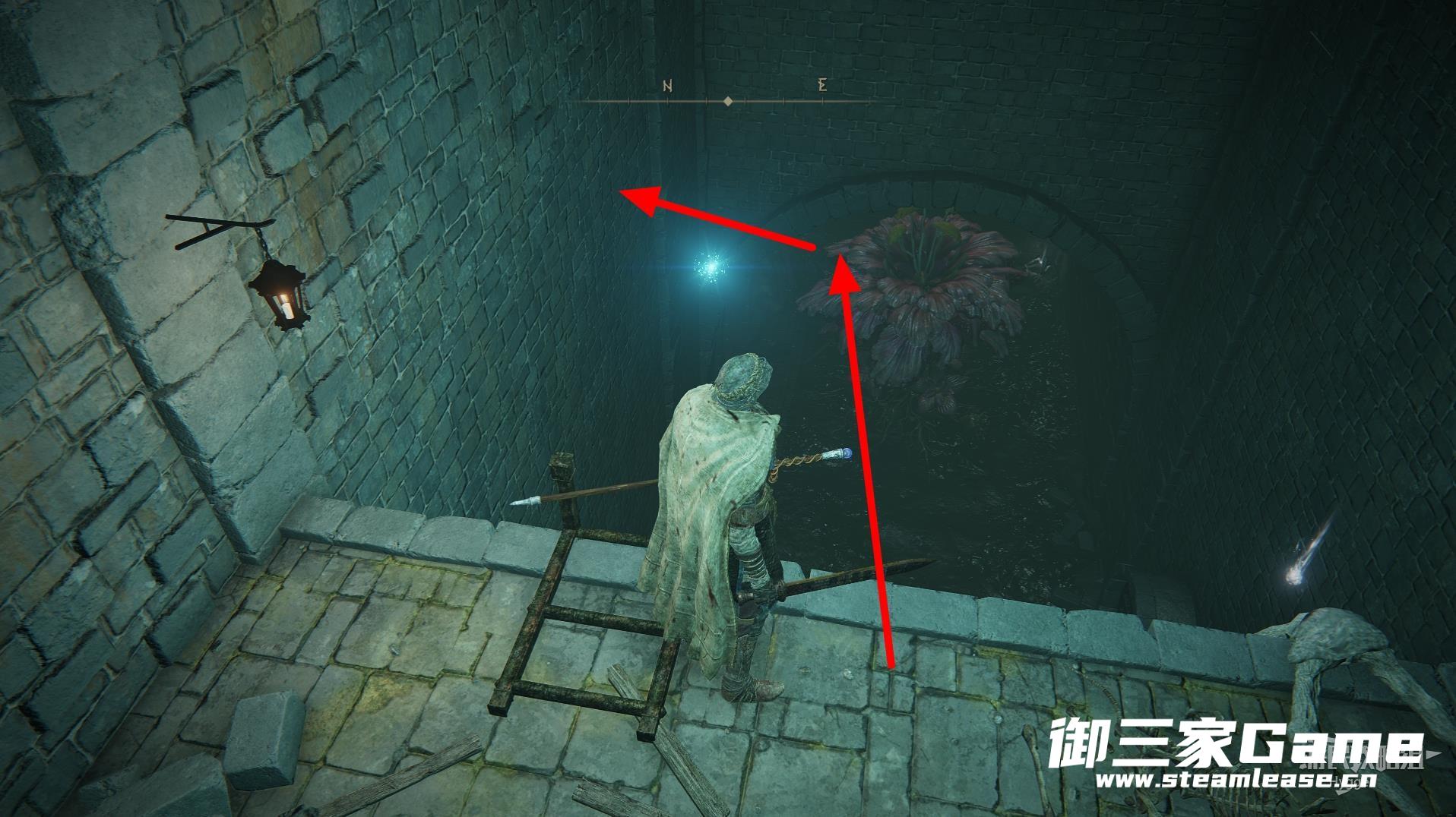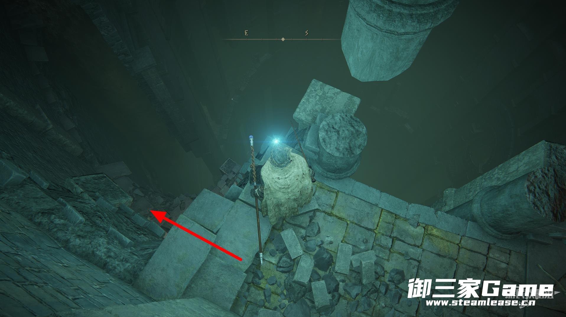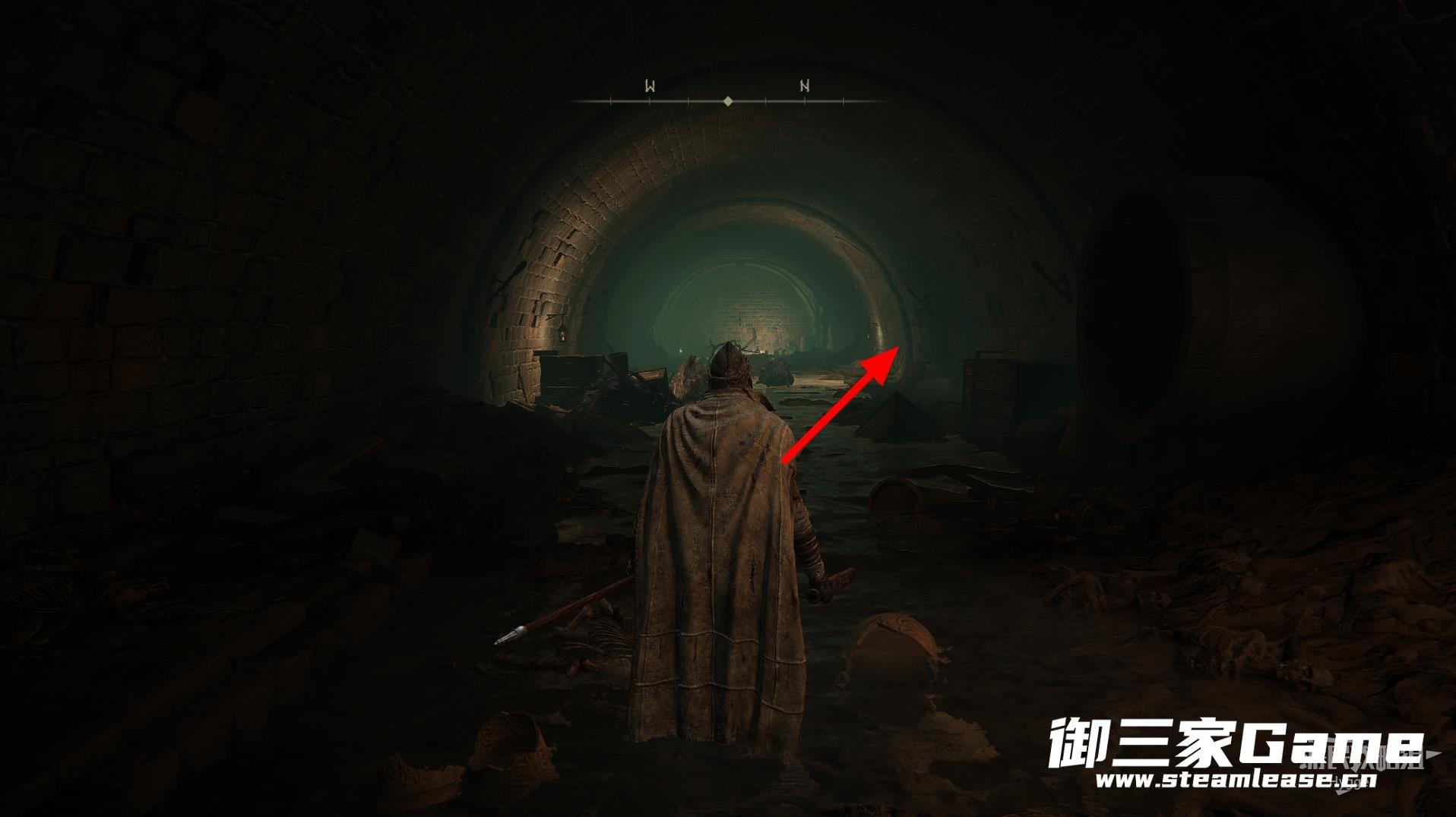 离开赐福所在房间后左转沿着大道前进,来到下图所示位置后从缺口处跳入管道。