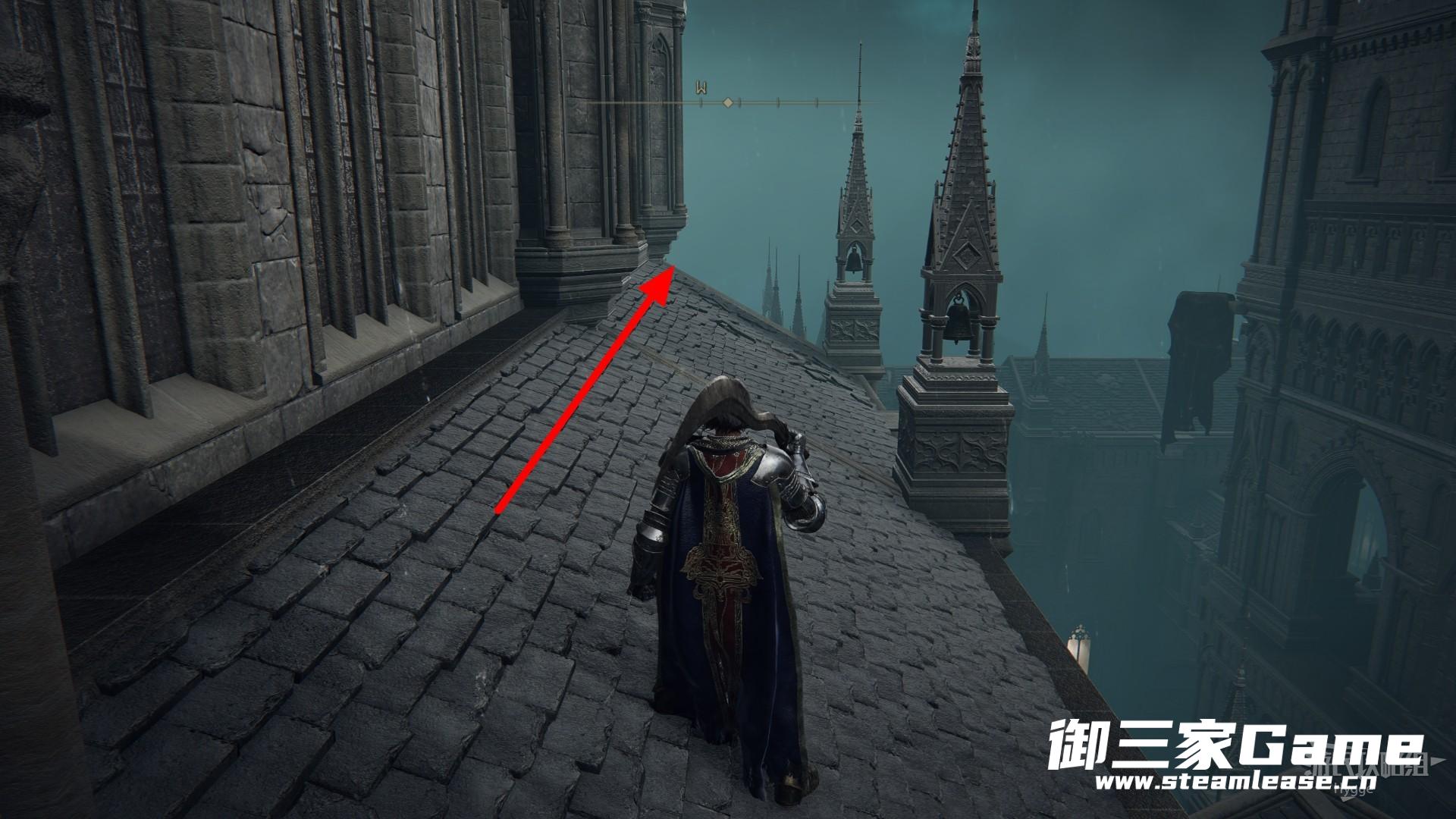 走到前方的钟楼下方后从右侧继续前进跳至屋顶上。