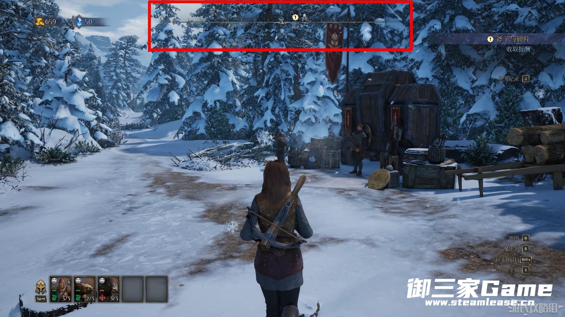 界面上方正中央为罗盘,我们可以通过罗盘快速寻找任务目标和NPC。
