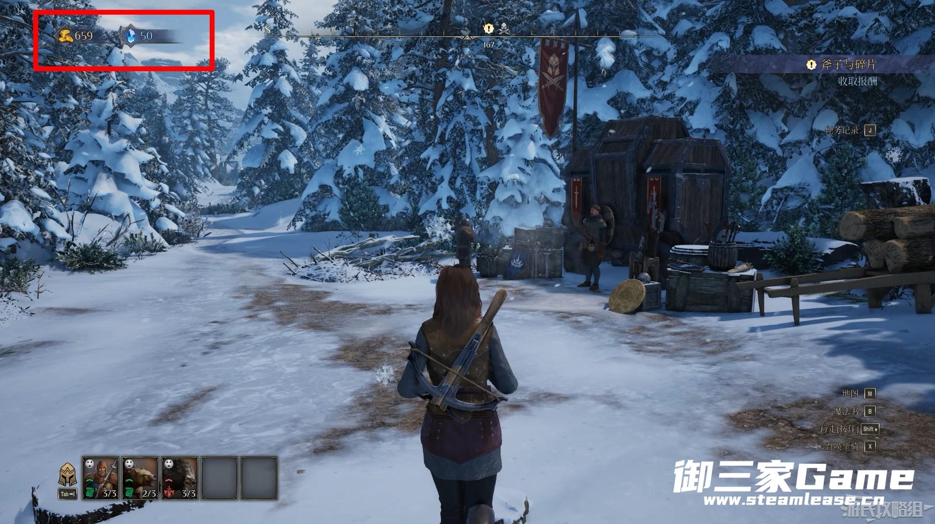 界面左上角显示当前我们所拥有的金币和法力储备,金币能够在商人处购买道具和招募军队,而法力储备则是研究和释放法术的必备材料。