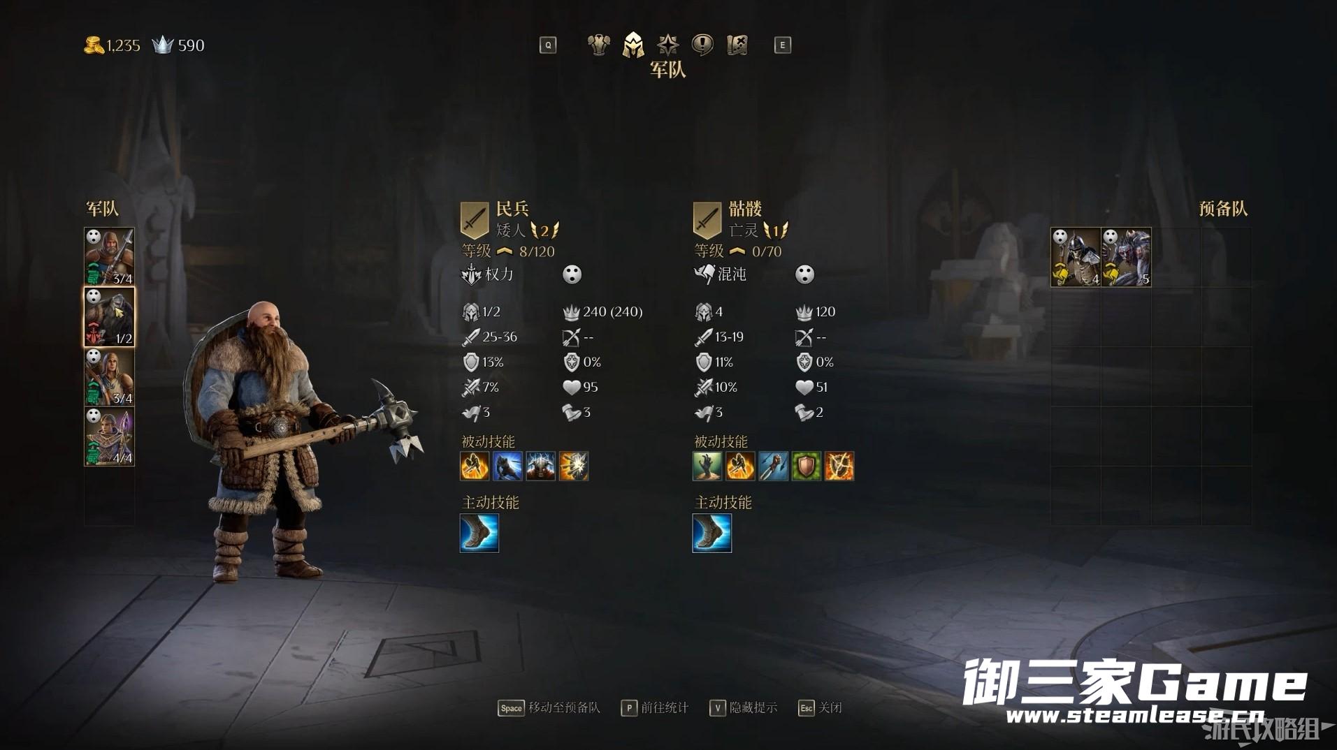按下Y键可以打开军队界面,玩家可以在此处查看部队的情报和调整出战部队。