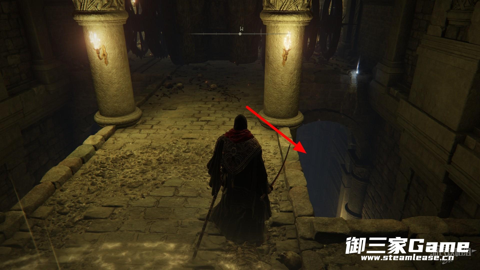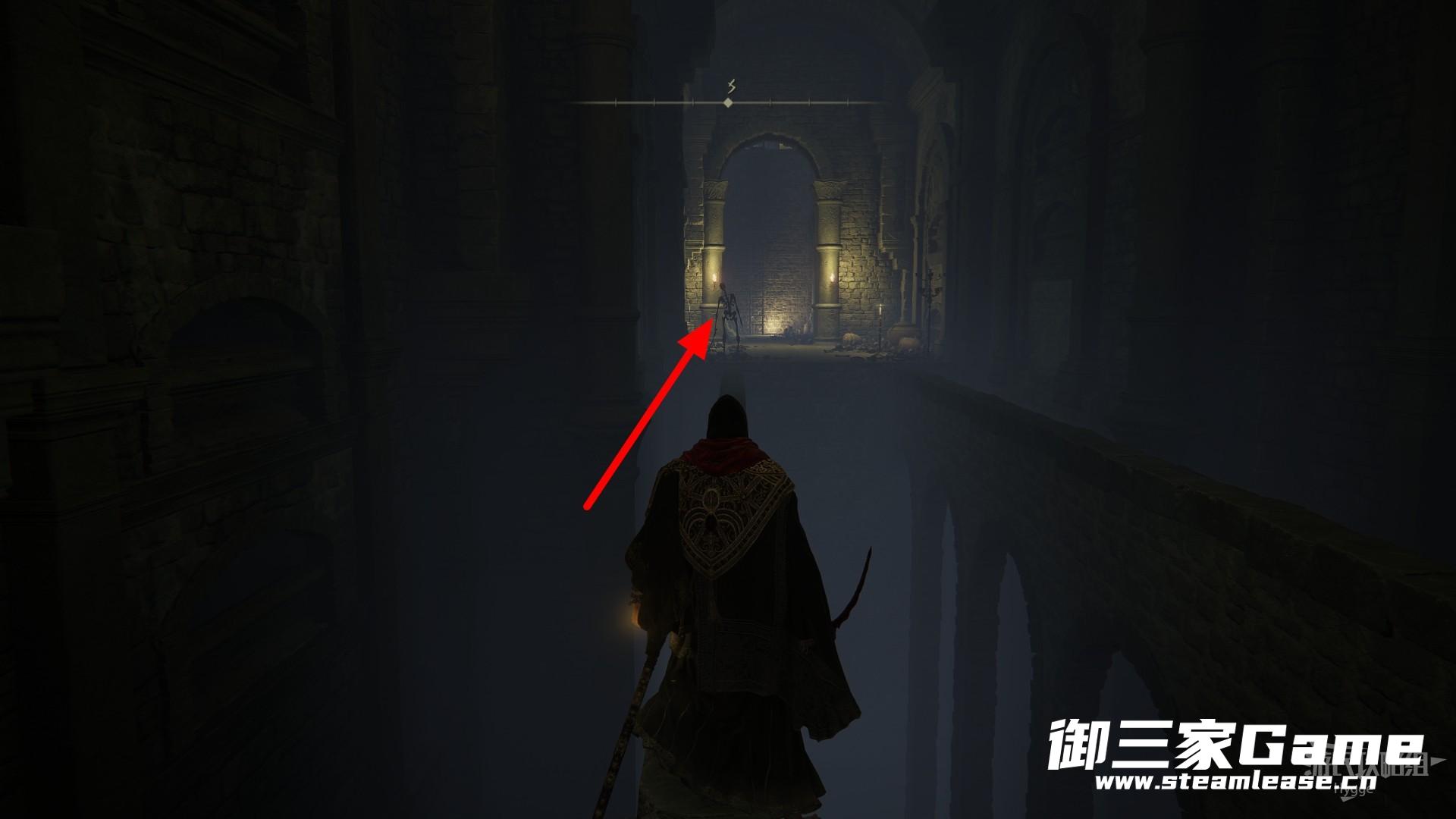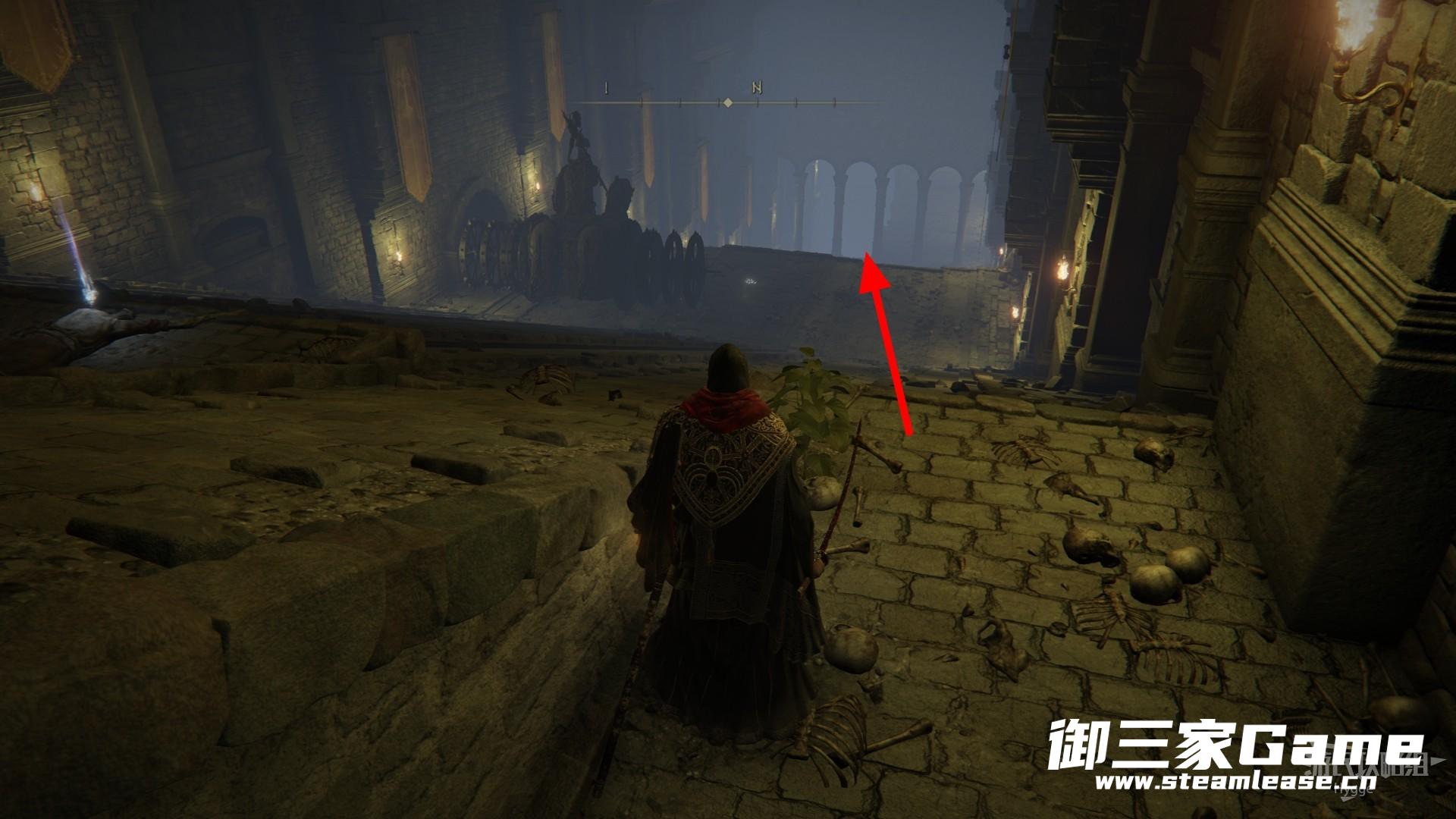 在经过两个骷髅后左转来到升降梯处,通过升降梯向上。
