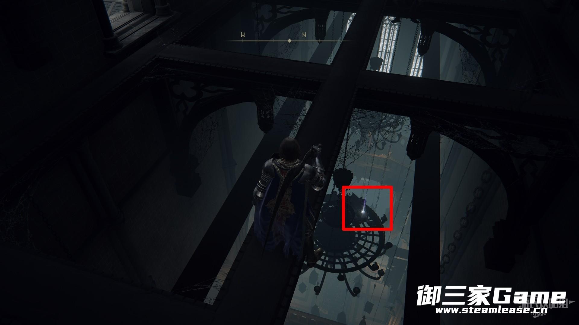 走到前方的钟楼下方后从右侧继续前进跳至屋顶上。