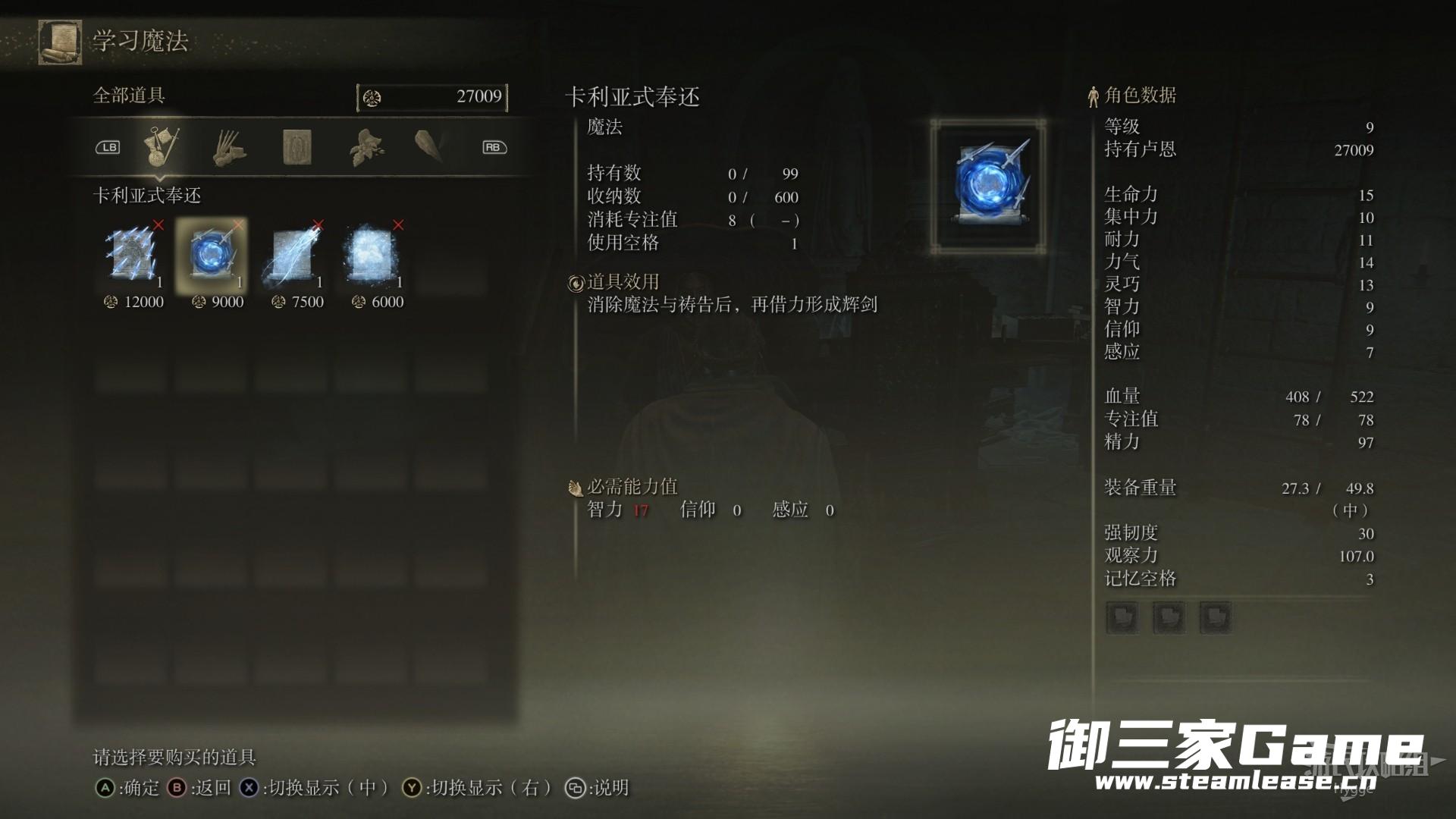 在NPC【赛尔维斯】处花费卢恩即可学习该魔法。
