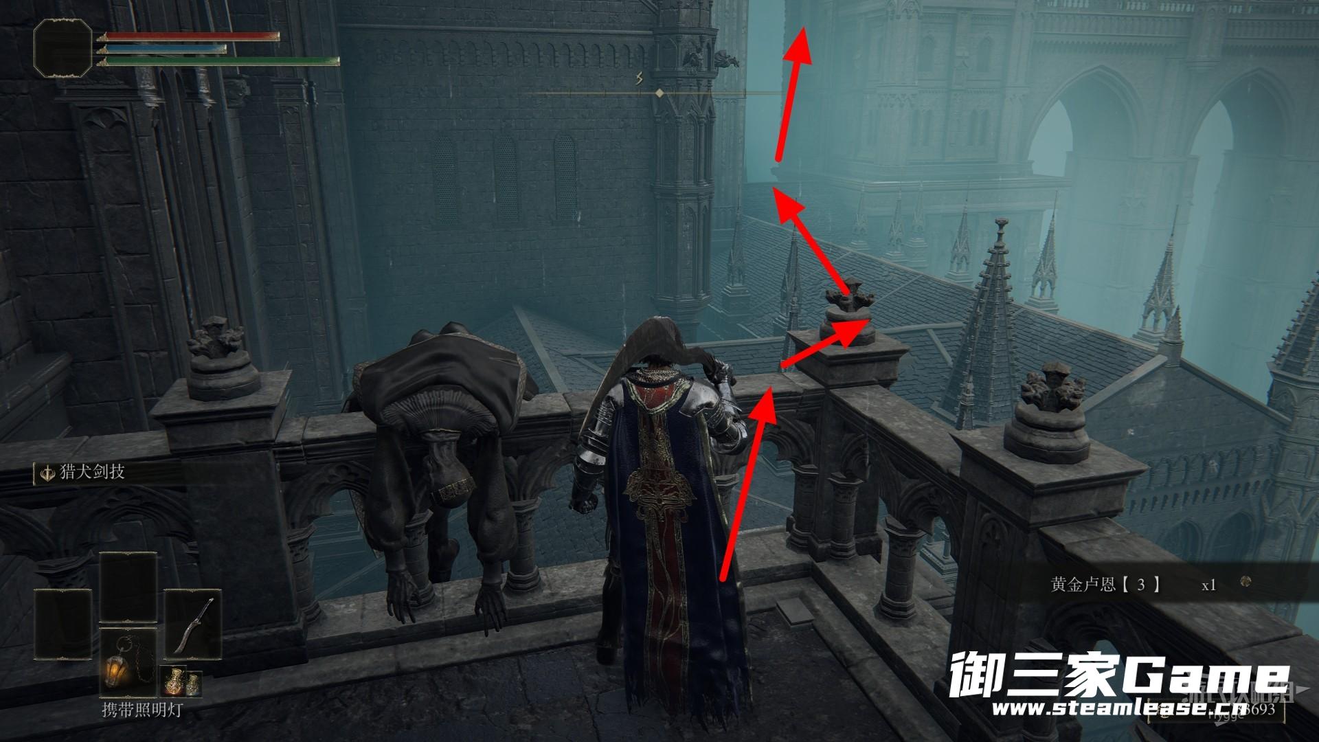 在三层平台左侧跳至下方后前进,在最前方左转。