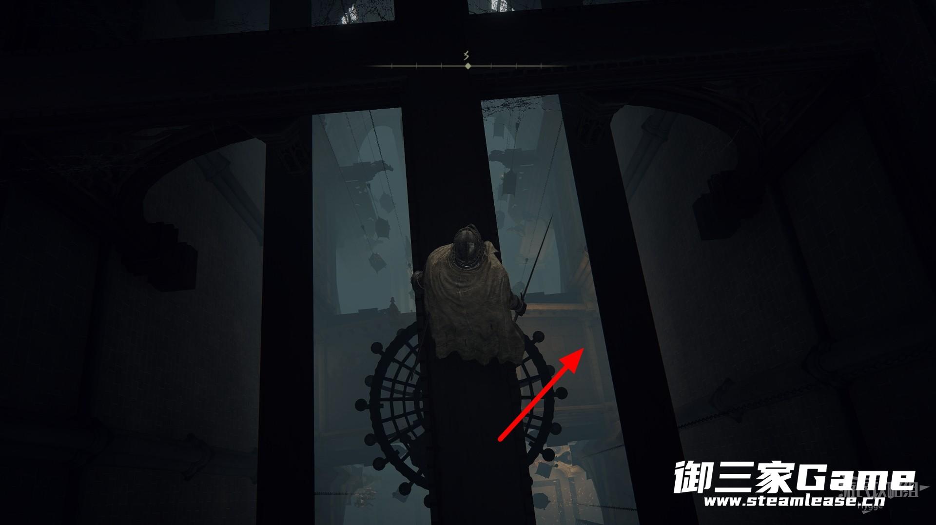 走到前方的钟楼下方后从右侧继续前进跳至屋顶上。