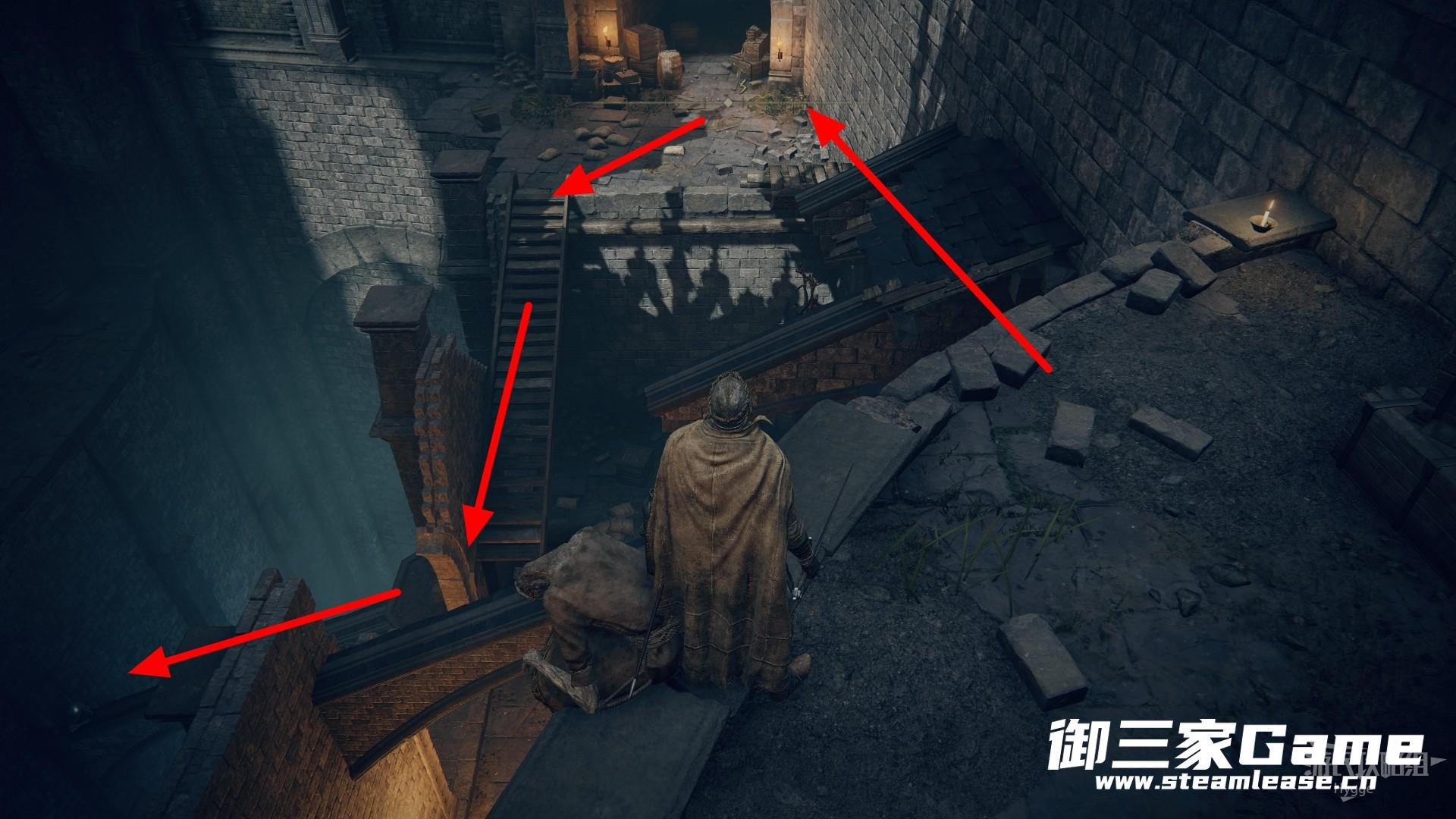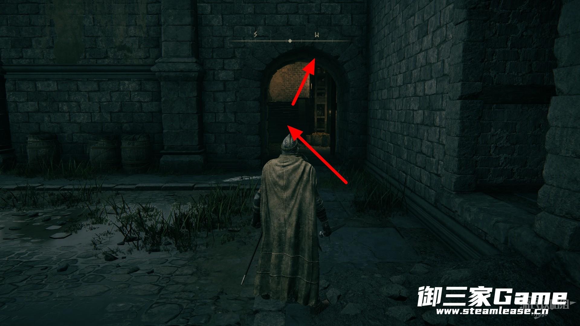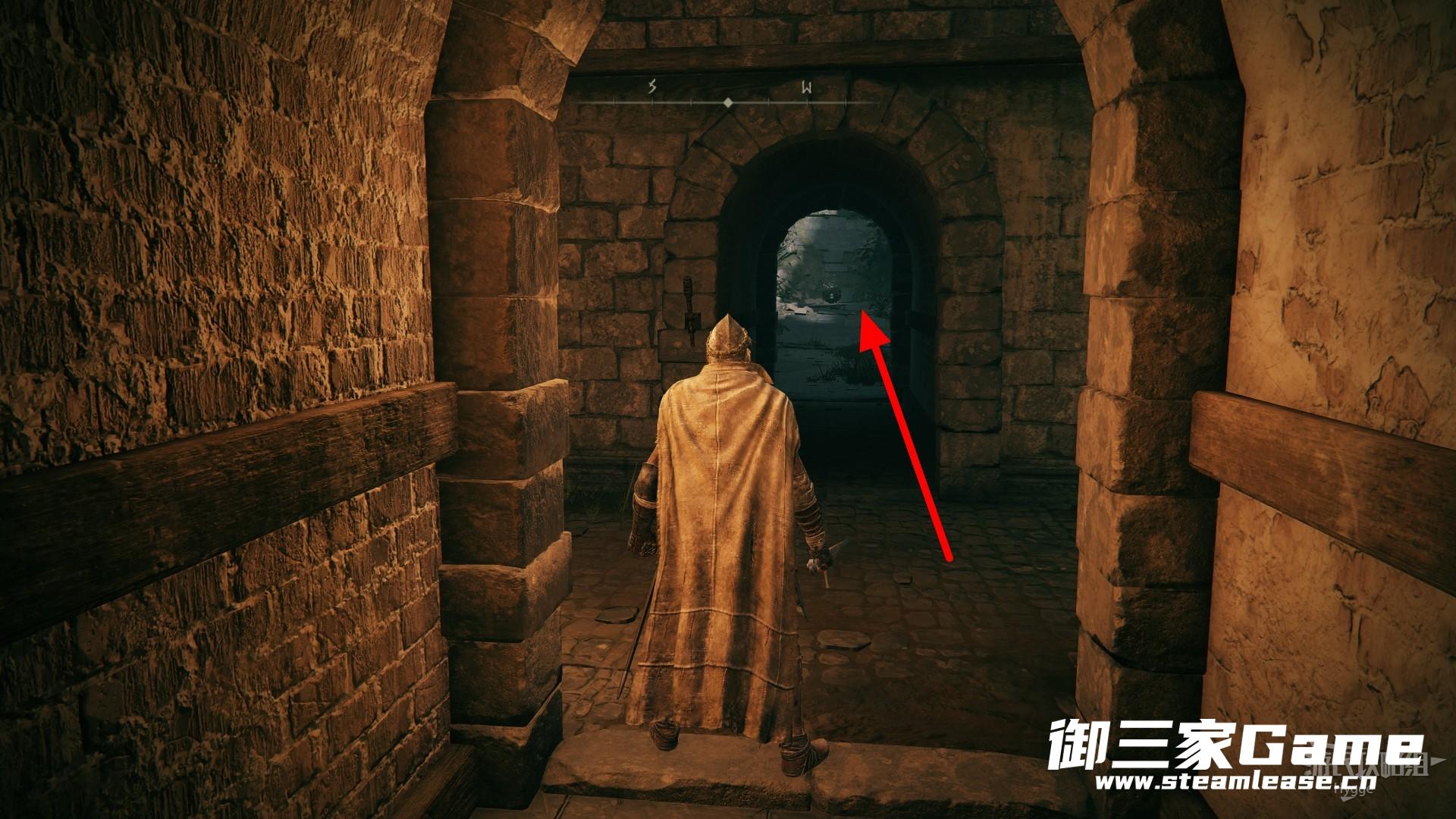 穿过窗户后右转,从右侧小房间中的楼梯向上。