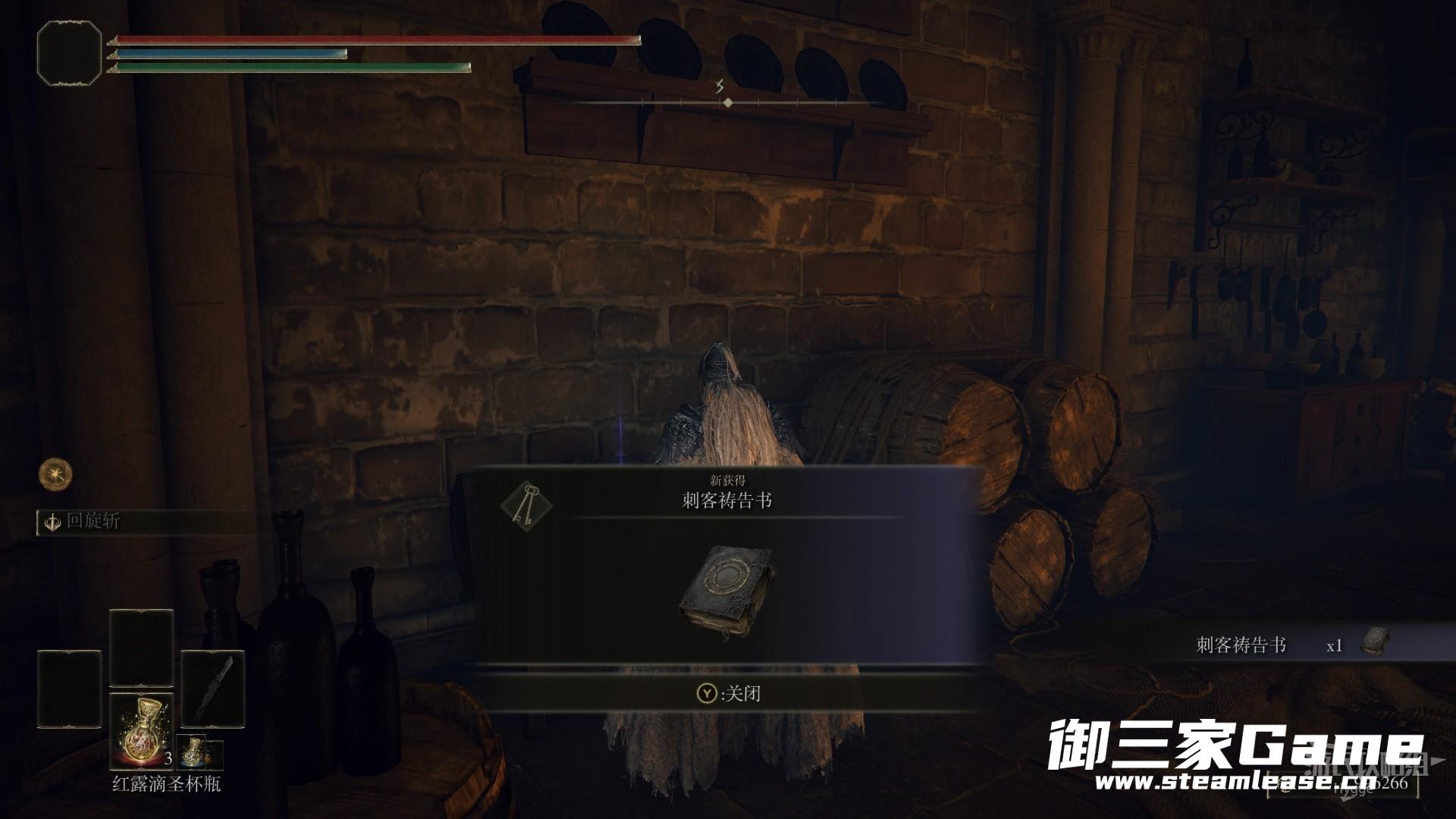 该祷告需要通过【刺客祷告书】获得,首先来到圆桌厅堂从铁匠旁边的楼梯到达下层。