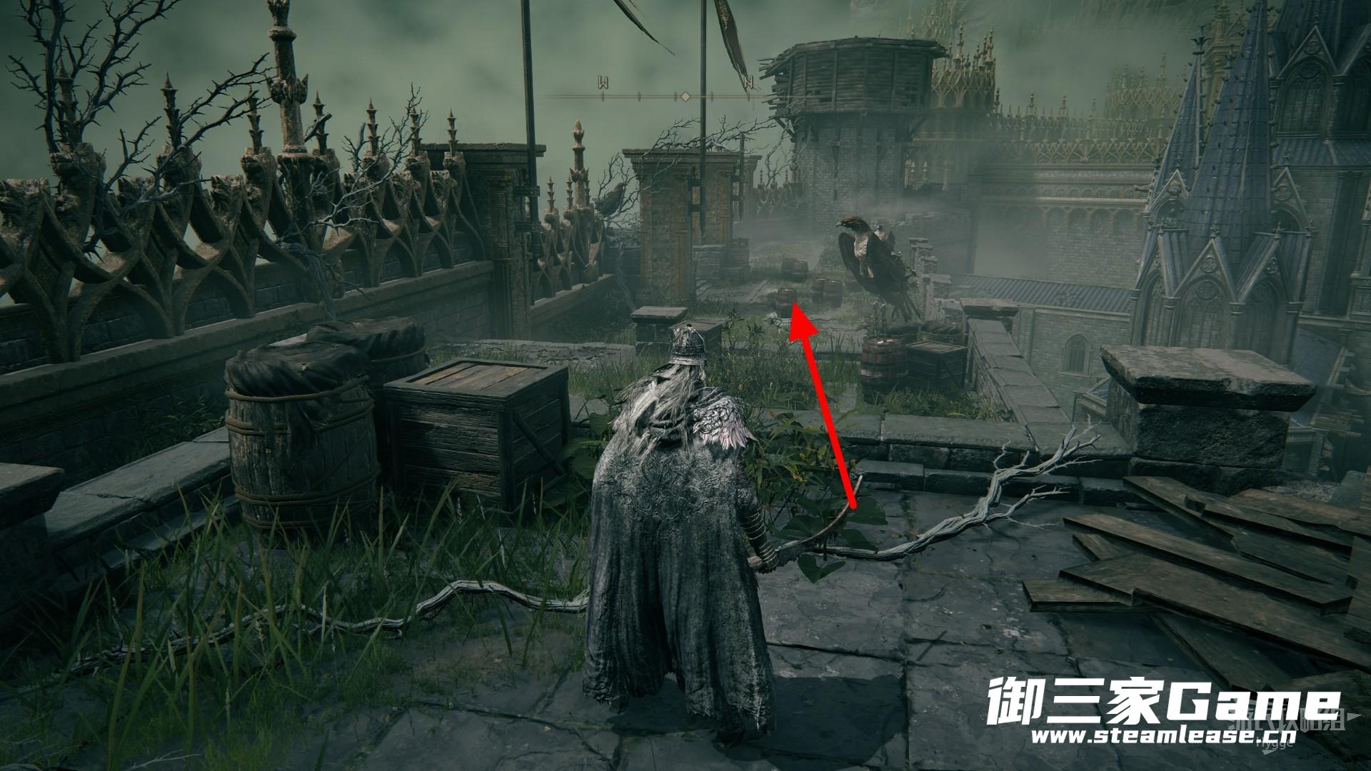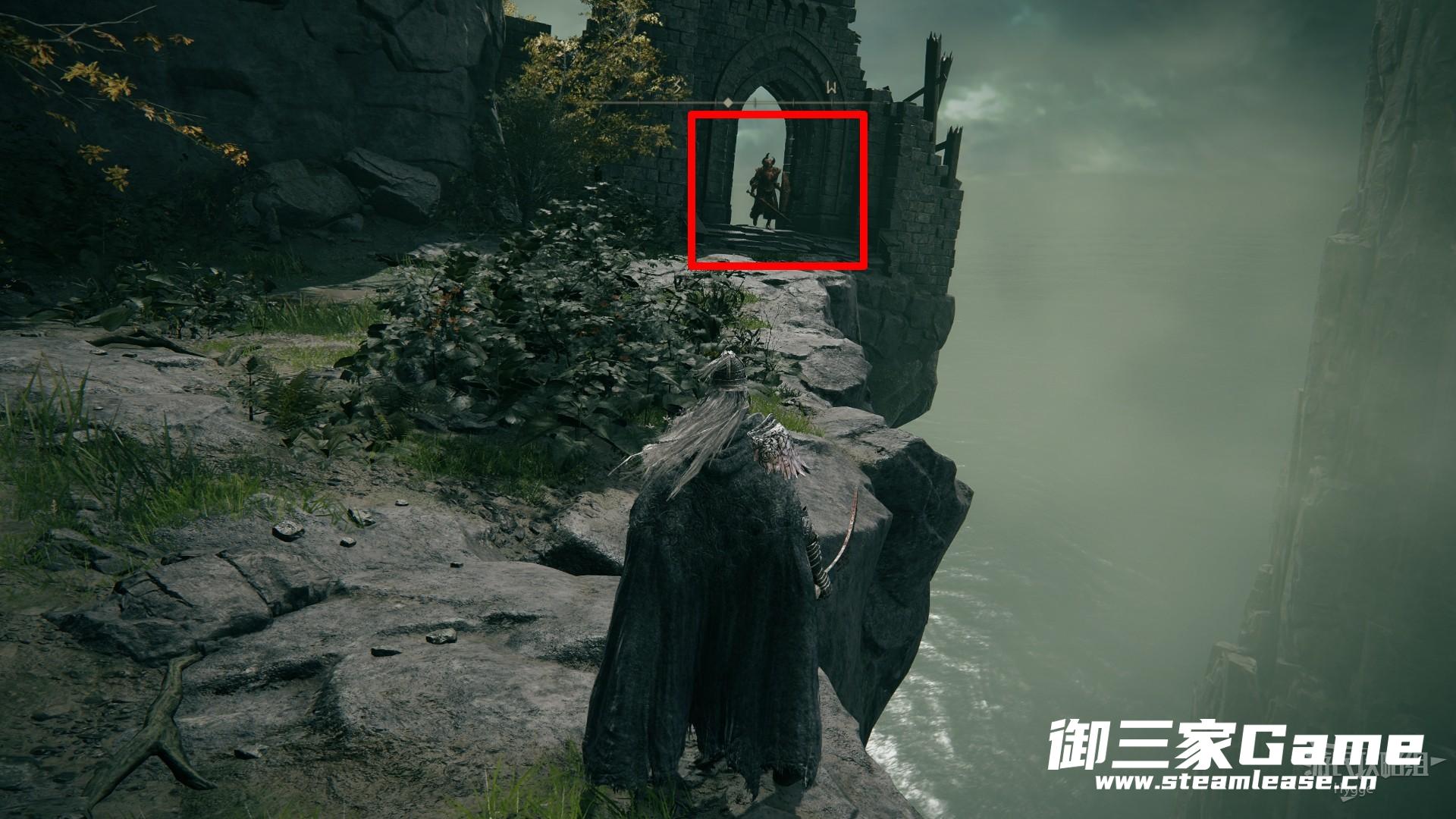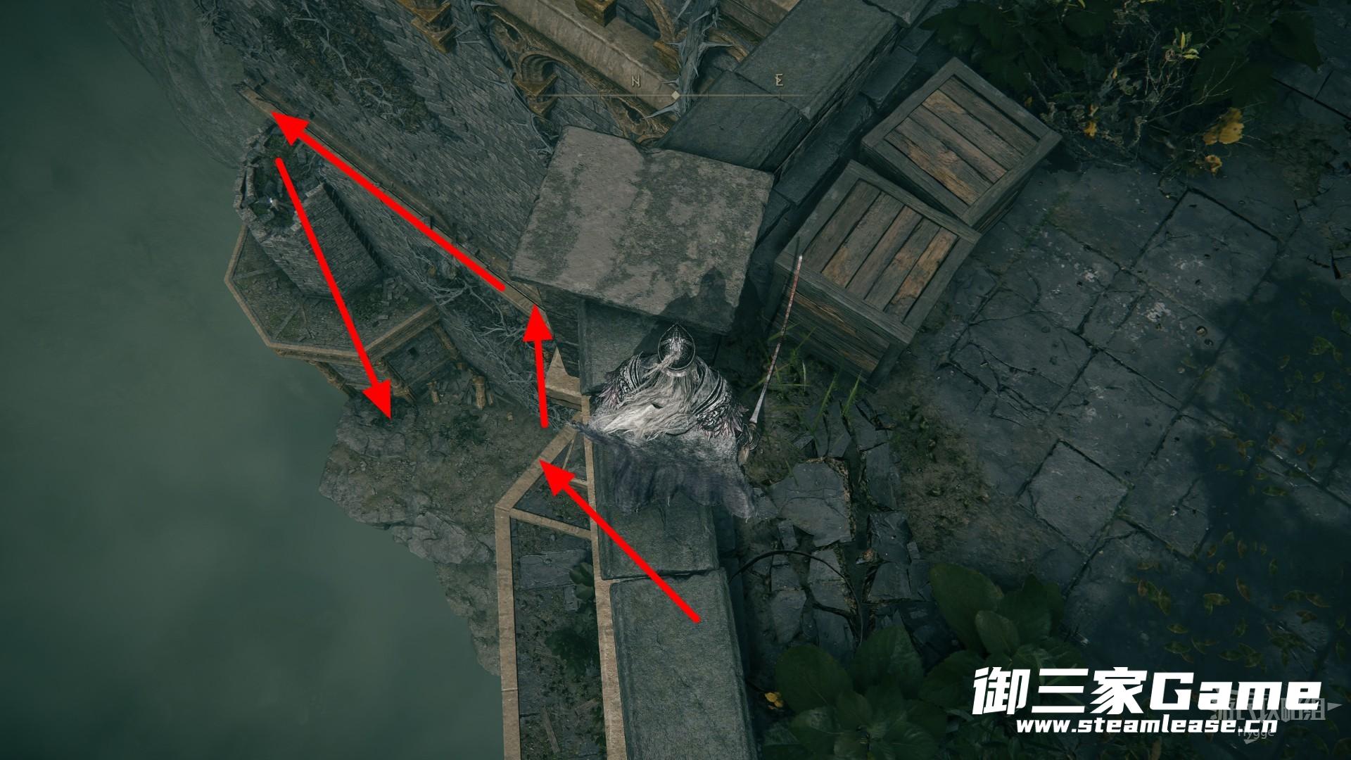 从左侧的露台处跳至下方,沿着墙壁边缘前进向下。