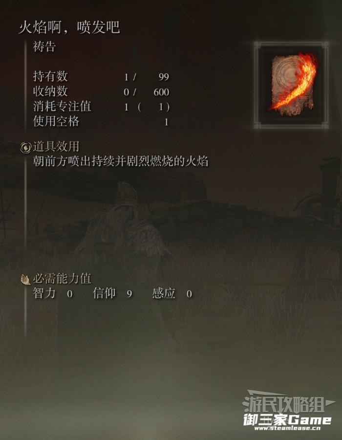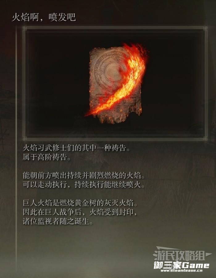 该祷告需要通过【火焰习武修士祷告书】获得,祷告书位于利耶尼亚湖【拉斯卡废墟】西边的营地中。