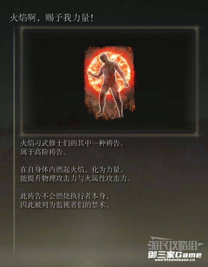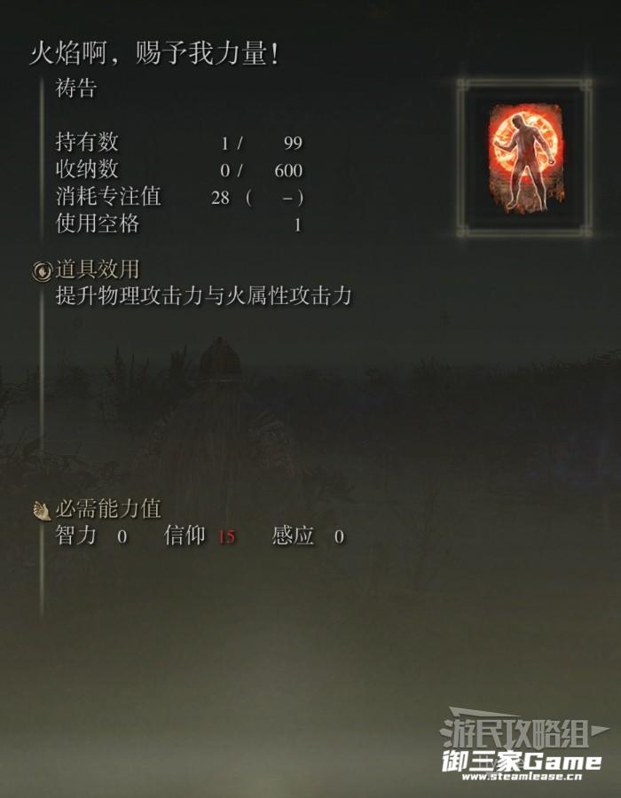 来到城堡后侧在下方两台火焰车中间的尸体上可以找到该祷告。