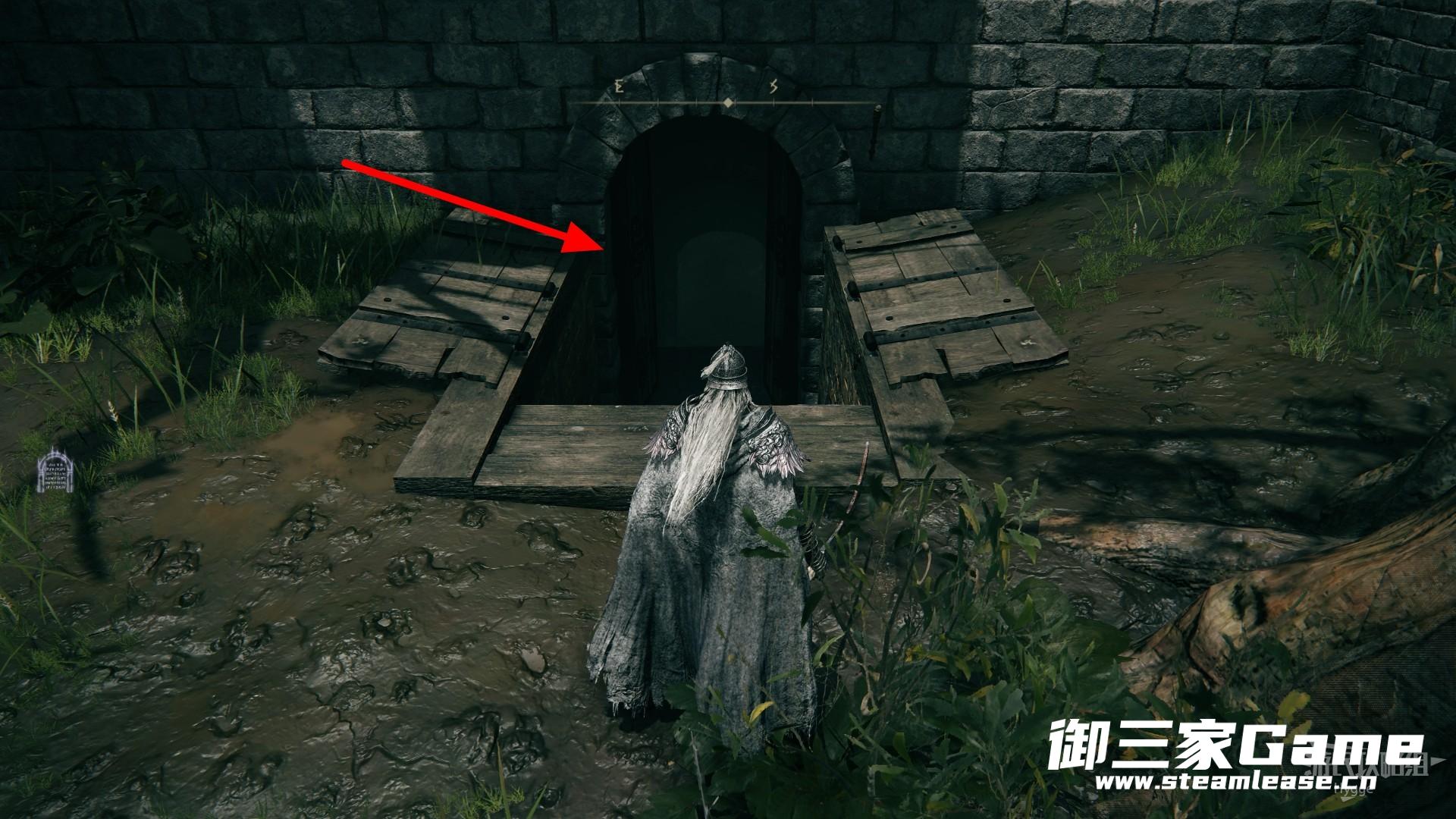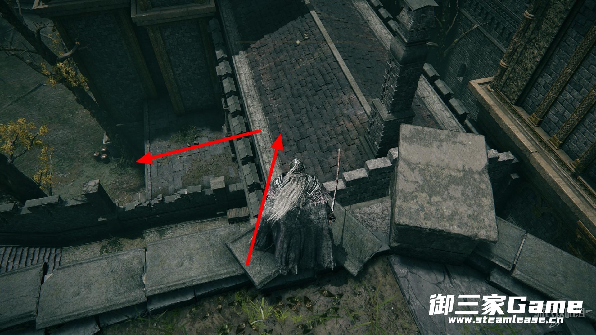 离开房间后跳至前方的屋顶上,再向左跳至下方广场。