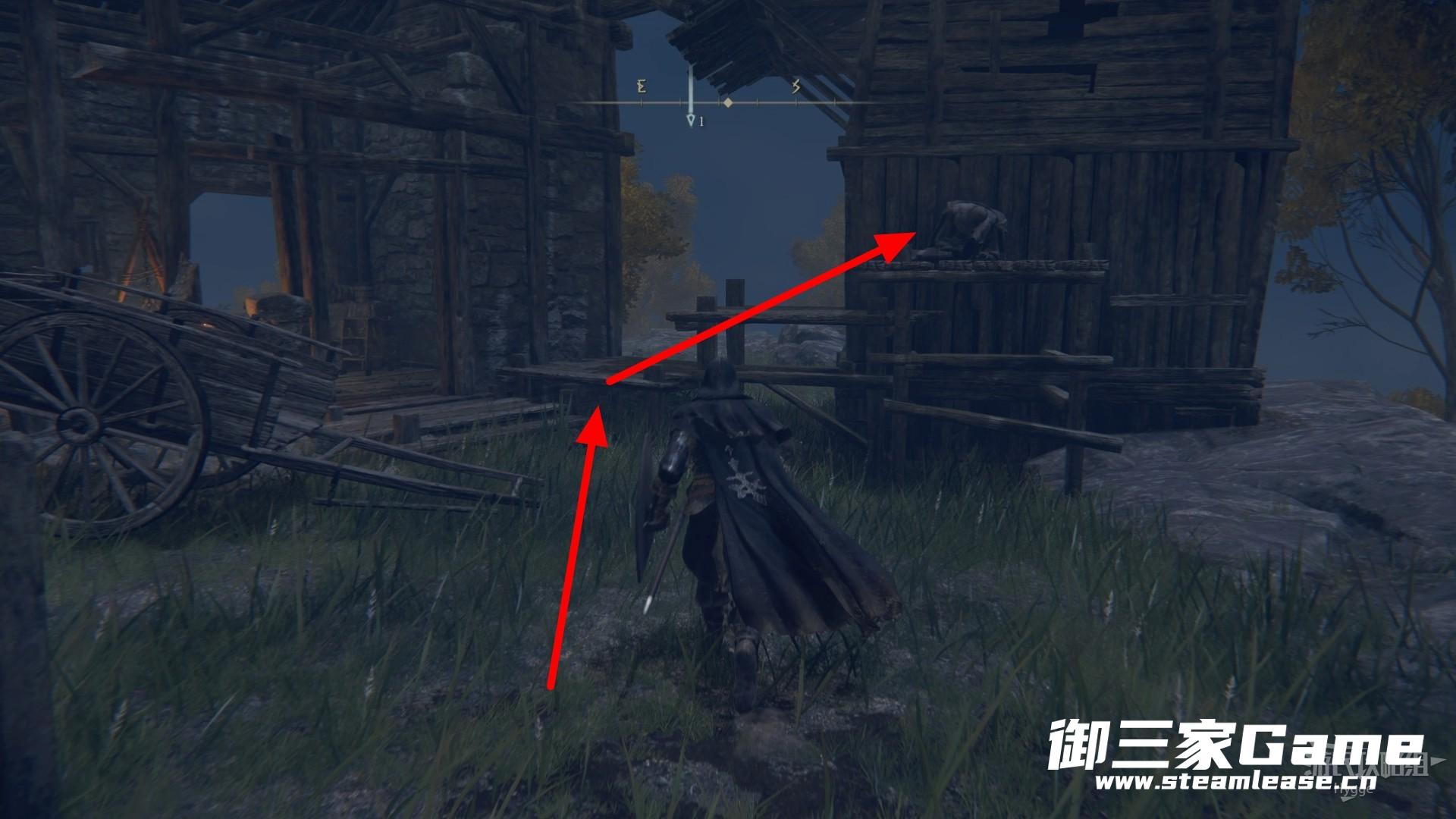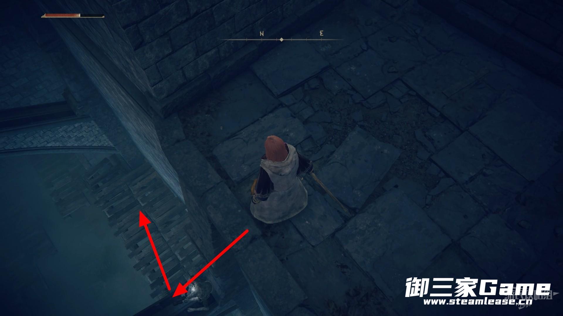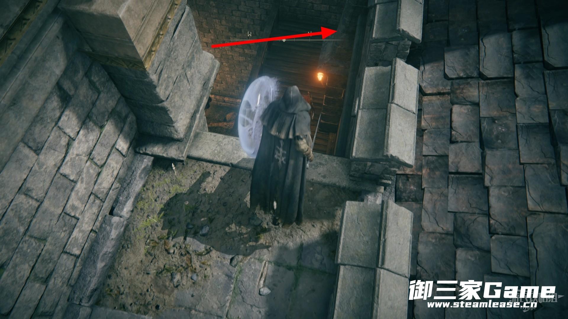 穿过屋顶后跳至下方平台,进入前方右侧的门洞。