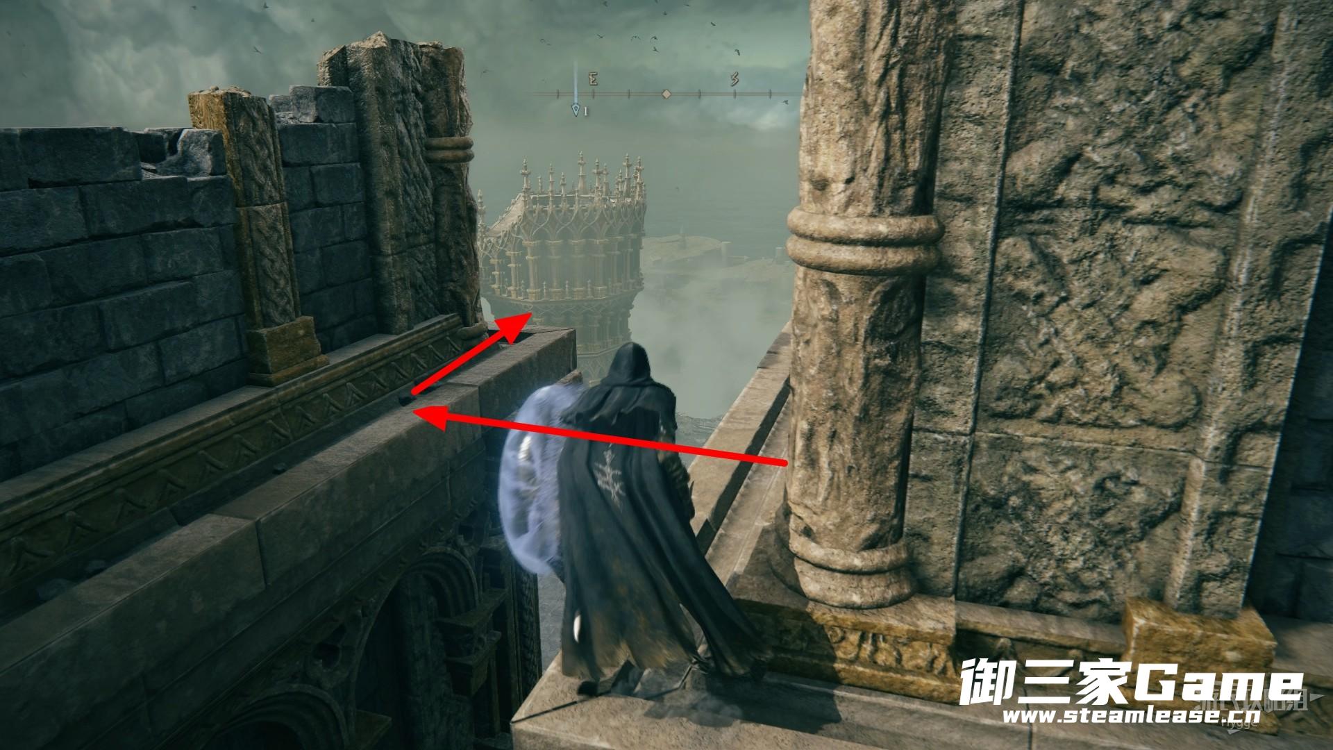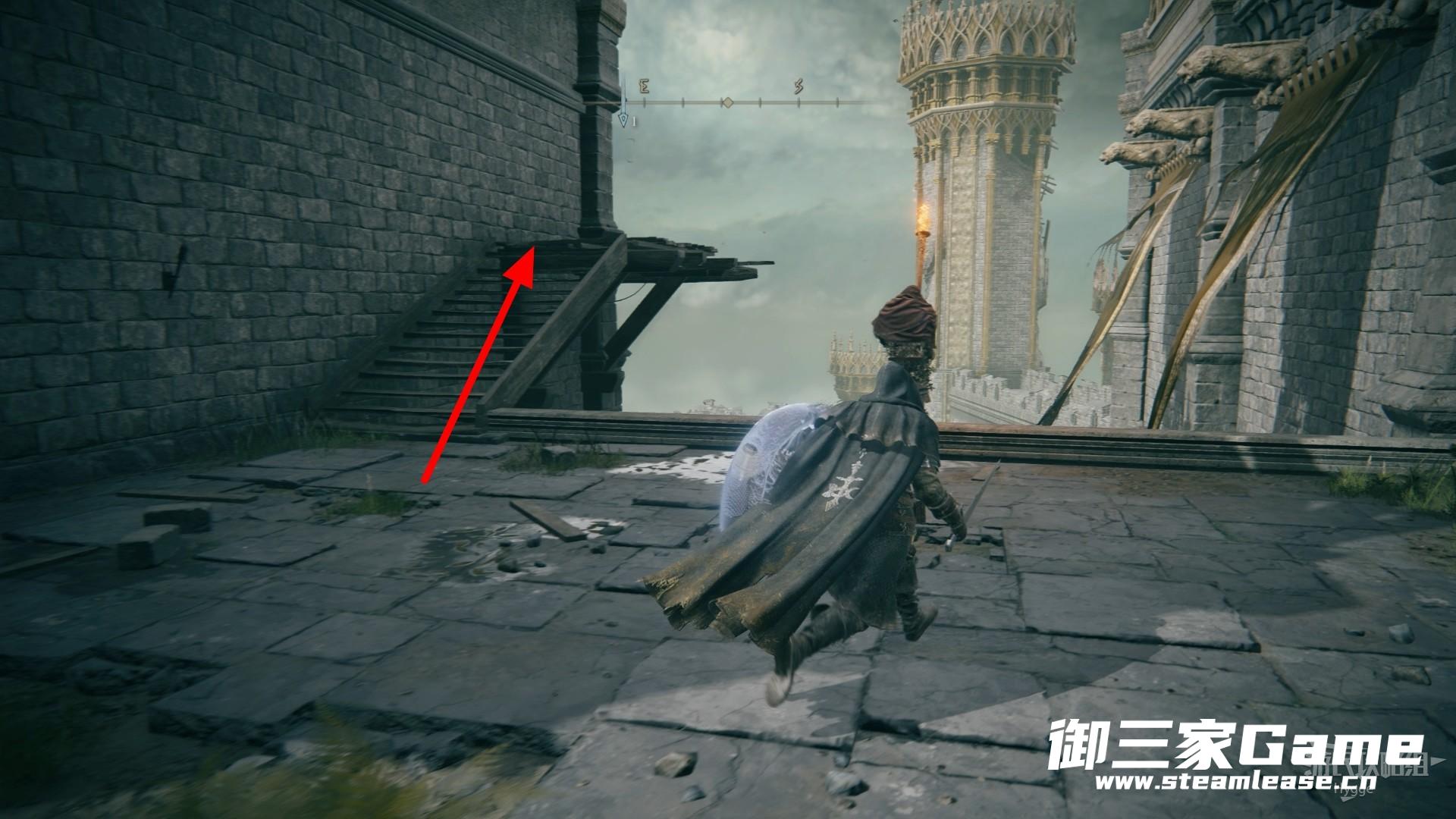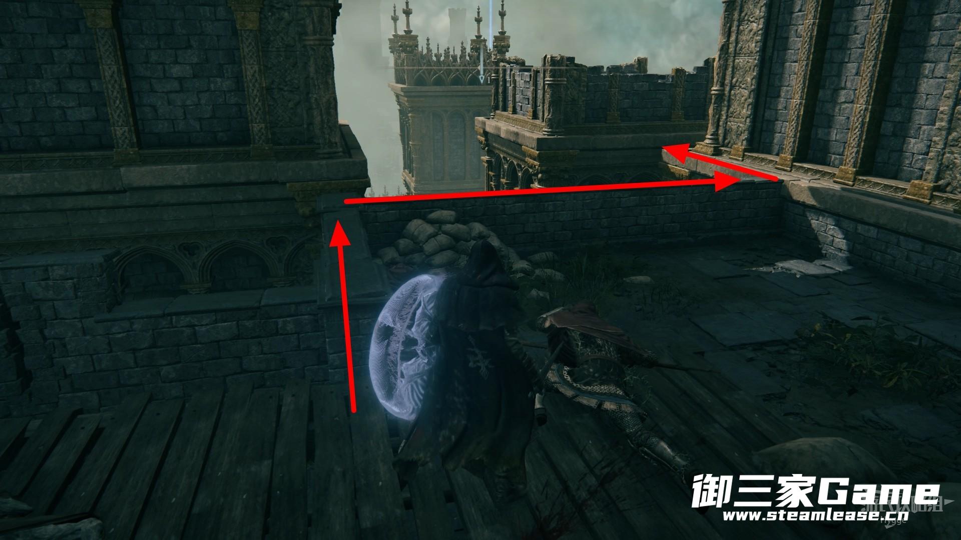 通过楼梯来到城堡顶部后,通过木台跳到城堡女儿墙上,沿着下图所示线路前进。