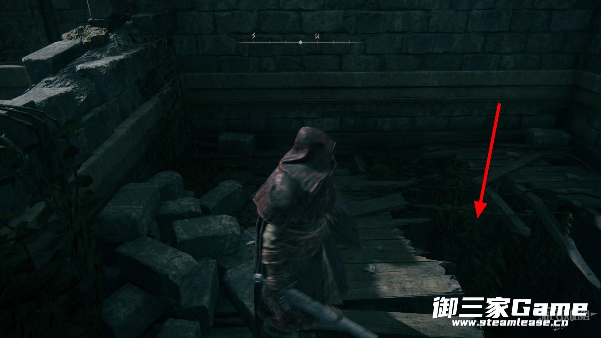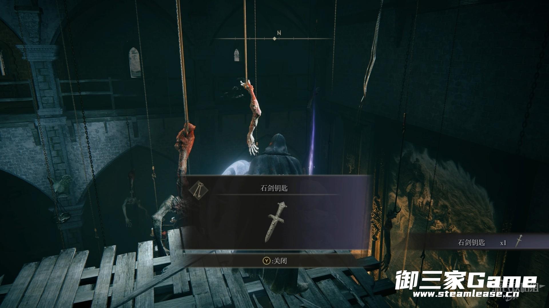 来到房间左侧的平台后在角落的尸体上找到一把石剑钥匙。