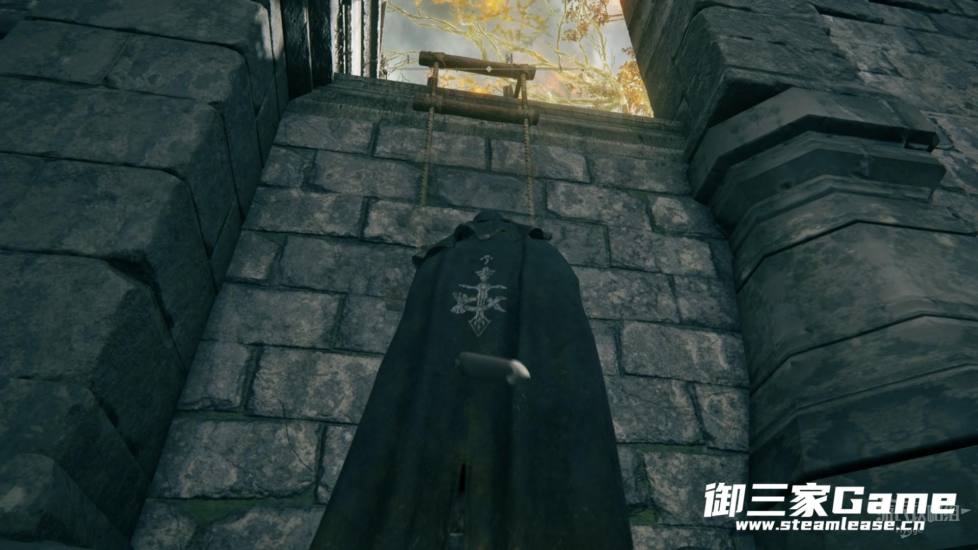 通过墙壁上的缺口进入塔楼后跳到下层。