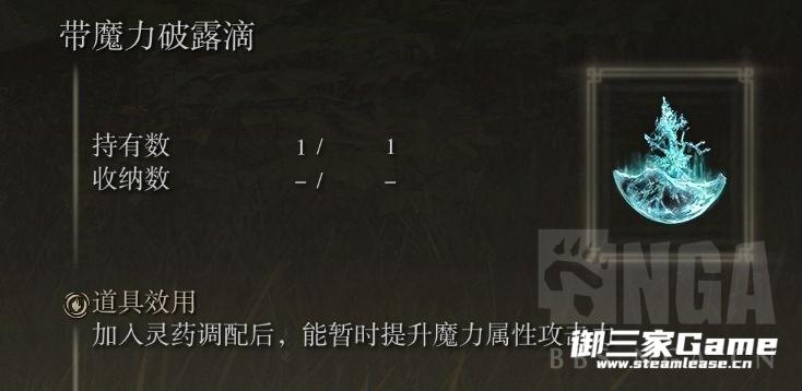 暂时提升魔力/雷/圣属性攻击力,出自魔法学院右上角,群集灵庙附近那颗黄金树。注:该黄金树可以绕过外面的小怪拉到侧面单独击杀。