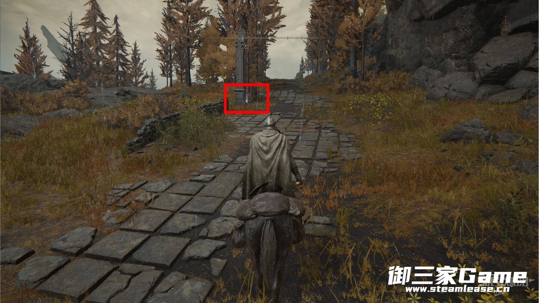 在道路旁的石碑下方可以找到该地图碎片,在拾取地图碎片时需要小心来自前方的石像巨人射出的巨型箭矢。