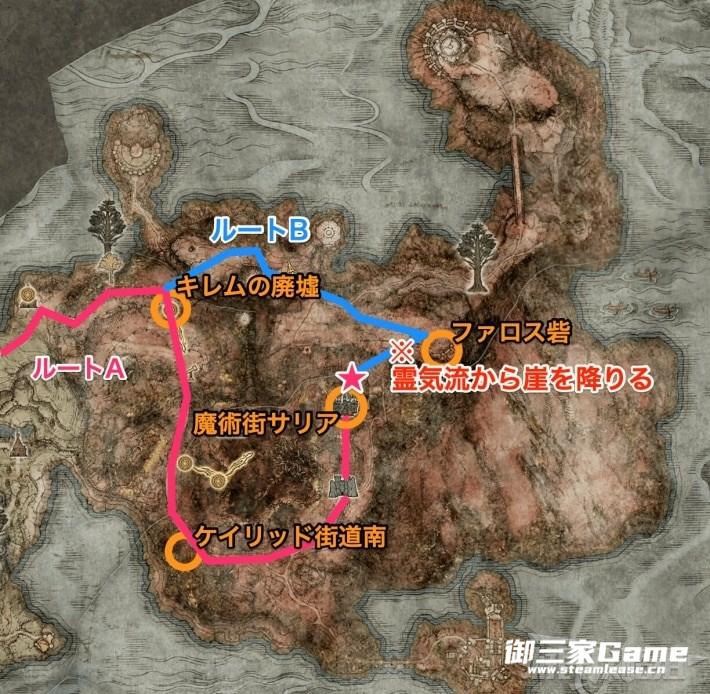 从魔法镇瑟利亚前的门进去的话,建议选择路线A(下方粉色路线),当然也可以利用法洛斯要塞旁边的上升气流,从上方悬崖跳到魔法镇中房子的屋顶上,也可以到达种子位置。