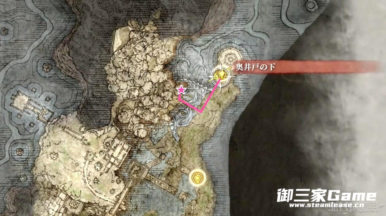 位于地图左下方赐福点「出口井的下方」的桥对面,桥上有敌人射箭,建议骑马直接跑过去。