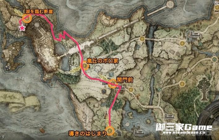 (下图标记赐福点位置自下至上依次为引导之始,关卡前方,风暴山丘的破屋,傍湖断崖)