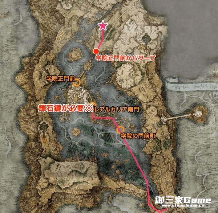 (下图标记赐福点位置自下至上依次为学院门前镇、雷亚卢卡利亚南门、学院正门口;南门红字标记为需要辉石钥匙,星标处红字标记为传送至学院正门前)