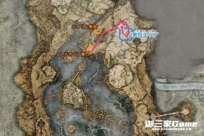 位于彼鲁姆教堂西北边的一座小山上,可以根据下图粉色路线到达。如下图蓝色标记区域所示,进入该区域后会进入发狂状态,建议进入该区域前更换可以增加理智度的防具,必要时使用圣杯瓶回血。